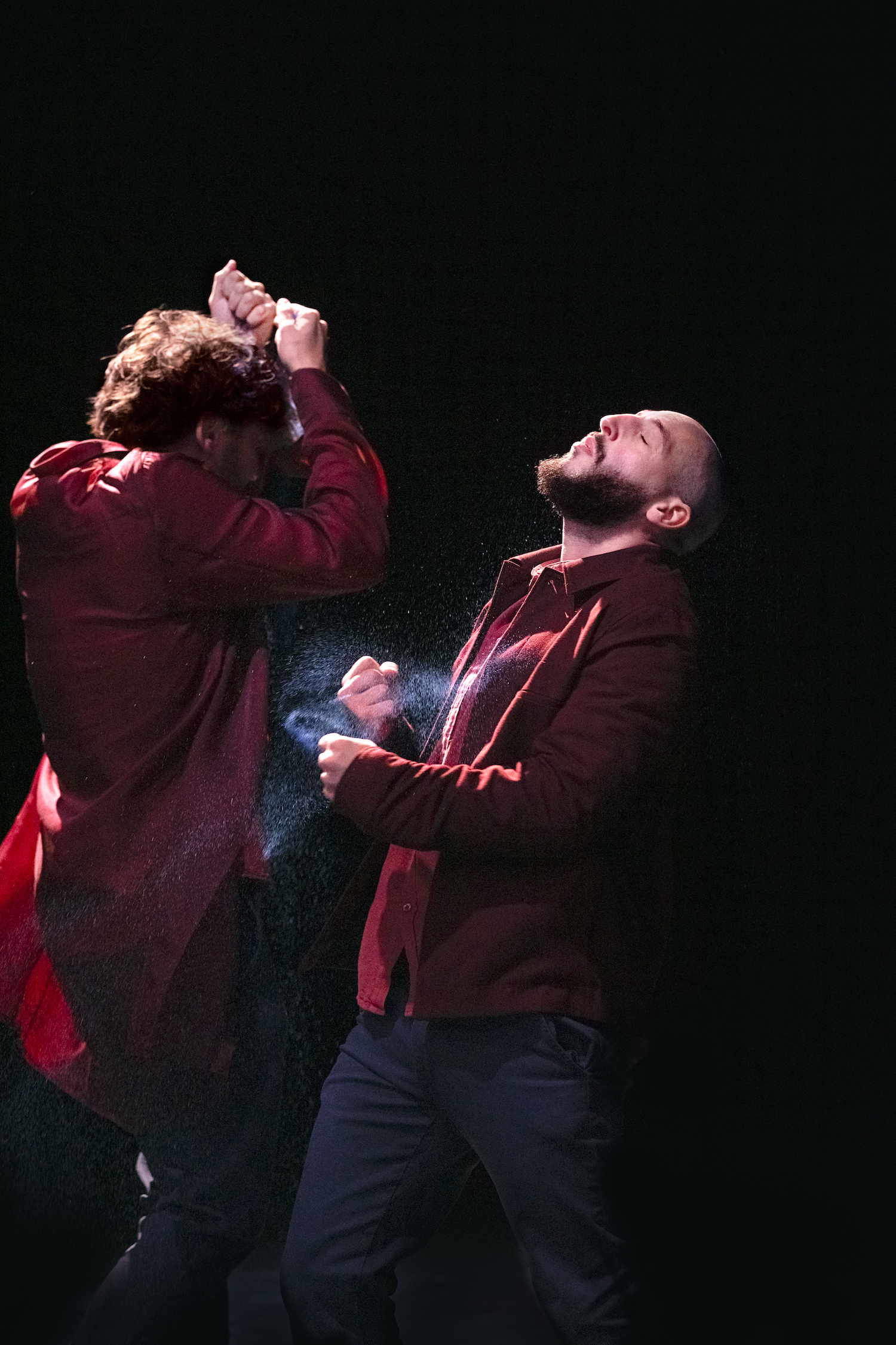 C’est en effet à une « tempête sous un crâne », pour reprendre les mots d’un autre grand poète, qu’il nous est ici donné d’assister. Entre pensées, souvenirs, propos esquissés et phrases à demi interrompues, Sami Blond livre ce qui l’habite dans un flux en apparence désordonné voire obscur, en réalité construit et mis en mots par la dramaturge Mona El Yafi. L’intention de Fouad Boussouf était de « tout mettre en œuvre pour qu’une personne qui(l)’inspire en vienne à révéler la part non visible qui l’anime, de manière plus ou moins consciente ». Un pari commandé, selon lui, par la forme même -autobiographique et introspective - du solo, doublé d’un second défi : mettre en geste et en espace cette exploration intérieure. Le résultat, à la fois subtil et accessible, fait d’abord évoluer le personnage et son double, vêtus d’un jean, d’une chemise et d’une veste dans les dégradés bleus mauves, en diagonales parallèles de part et d’autre du plateau. Leurs mouvements sont guidés par la petite voix intérieure du sujet, qui leur intime de ne pas s’arrêter (« Recommence ! »). A ce dédoublement sonore, de l’intimité du cerveau à la résonance du plateau, répond la présence de ce couple arpentant la scène côte à côte. Peu à peu, de même que dans le flot - le flow ? - du discours, mots et phrases progressivement se bousculent, au sol les traversées s’accélèrent, tandis que les deux hommes répandent au sol, ça et là, une mystérieuse poudre bleutée.