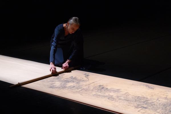 A travers ces appels d’un autre temps, Martin part en voyage intérieur et saute l’époque des exotismes bauschiens à la Mazurca Fogo et autres Sweet Mambo, puisque dans certains tableaux presque méditatifs, elle rend le temps élastique au possible, comme pour rejoindre l’univers de feu Raimund Hoghe. Après quoi elle semble se consumer dans les flammes d’un feu dont on entend le crépitement, allant vers la transe en tournoyant dans un mouvement répétitif, ses pieds ornant le sol d’empreintes de sable. Elle est une femme en lutte, presque animale. Alors, envol de l’âme ou descente du corps vers les enfers du Sacre du printemps ?