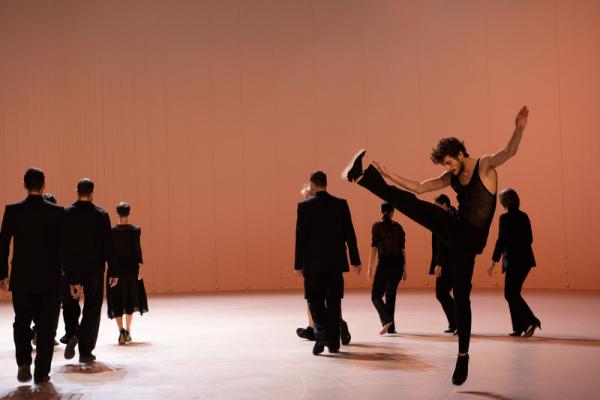La danse est surtout et d’abord constituée par la marche « en descendant » et « en remontant » la scène impressionnante du Palais Garnier mise à nu, avec ses murs chargés d’histoire, poussiéreux, apparents. Une sorte de vide absolu et d’essence du théâtre. La chorégraphie suit la musique à la lettre, et même à la note près ! On pourrait presque deviner à regarder les danseurs marcher dans leurs tenues chic et noires, l’allure de la partition. Flux de la marche, traitement du collectif et de l’individuel comme le fameux « ripieno » (l’ensemble des instruments) et les solistes.