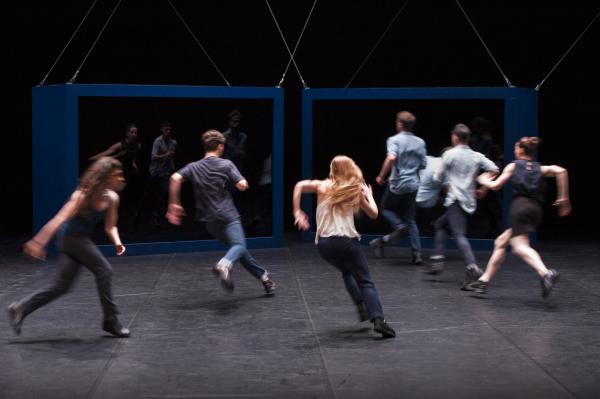 Mais on ne ressort pas abasourdi, ni accablé, d'Auguri. Souvent dans cette pièce, on peut sentir absurde sa propre position de spectateur assis ; éprouver l'envie de se lever. Enfin y aller. Se projeter dans l'implication inouïe des interprètes, chacun, chacune, occupé.e en personne à ébranler l'énergie collective du monde. Quel sens attribuer à ces courses folles ? Dans son entretien pour la feuille de salle, sans doute assez ancien, le chorégraphe dit son intention de tendre vers l' « absolu » du « bonheur ». On a bien perçu une séquence où cela s'élève en envols aériens d'enjambées bondissantes. Mais c'est bien moins évident à l'arrivée, quand ont été assimilées les séquences, combien plus inquiètes, de corps tassés et rampant au contact des parois de la scénographie.