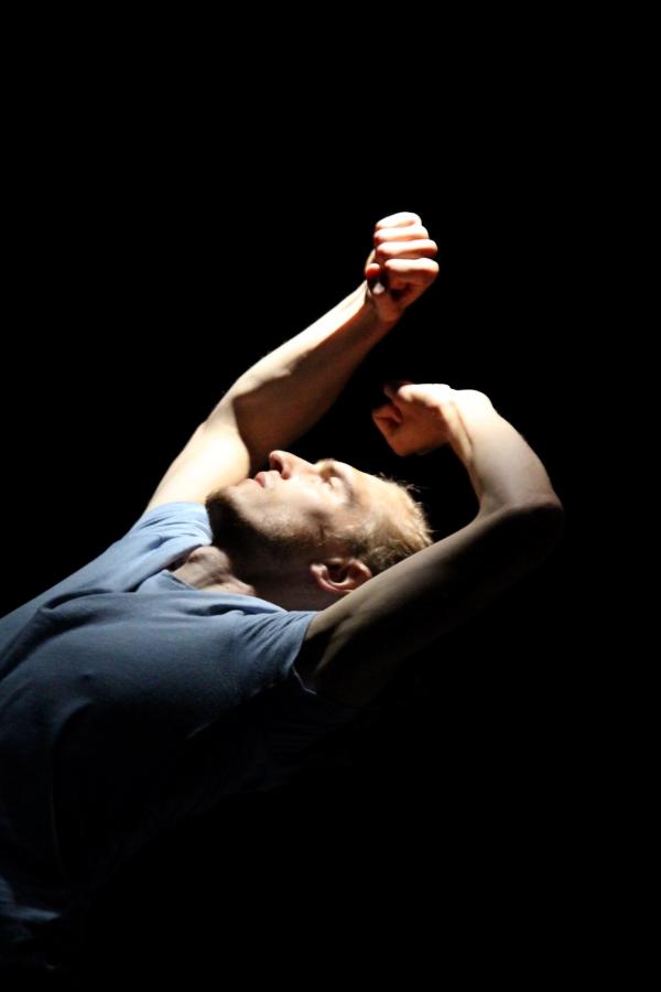 Dans un premier solo, Edouard Hue nous présente une chorégraphie très sautillante, répétitive qui débute sous un bel effet stroboscopique et où il semble combattre un partenaire imaginaire. Il s'impose également des moments de calme qui nous permettent d’apprécier sa belle esthétique, bien éclairée par les variations incessantes de lumière d'Arnaud Viala.