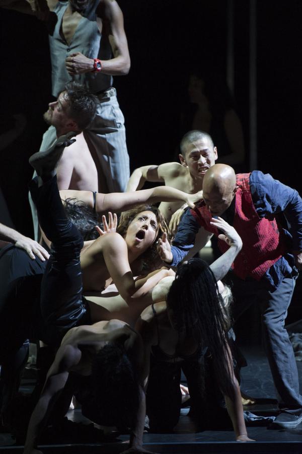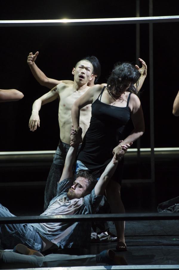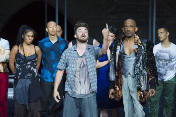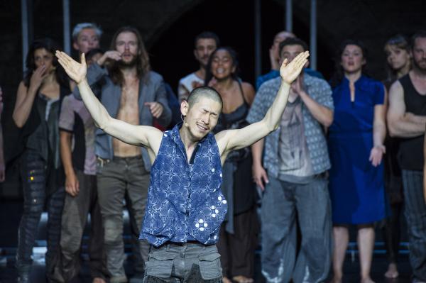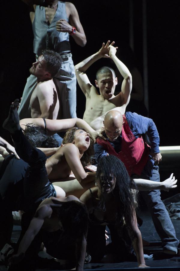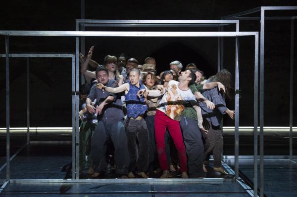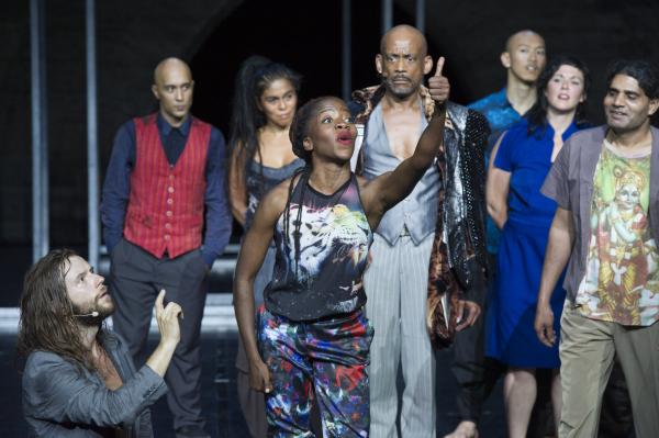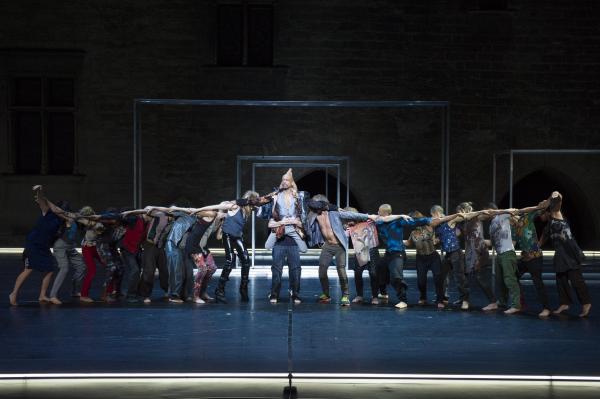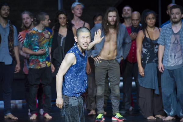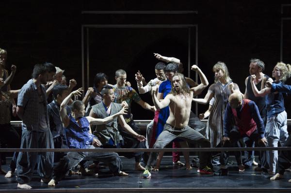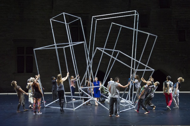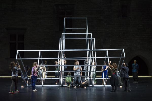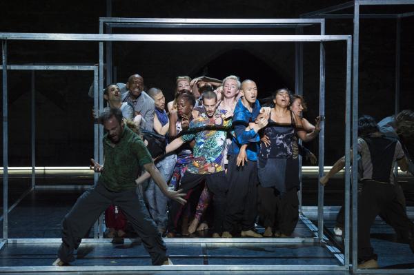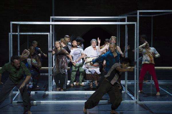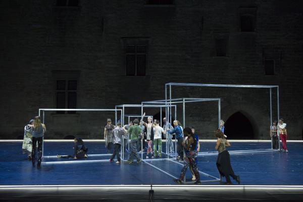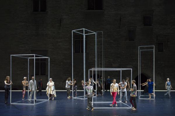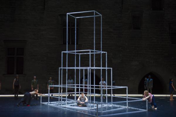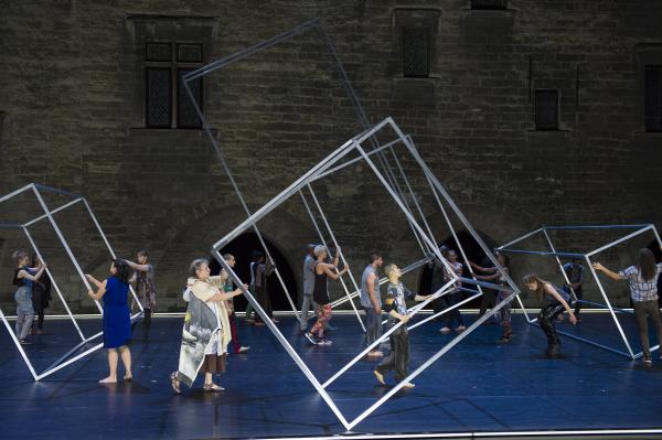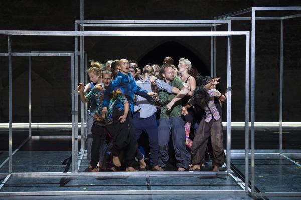 Cet assemblage prend son sens réel lorsque les éléments de scénographies, de grands cadres métalliques rectangulaires signifiant les cinq continents, se chevauchent et s’emboitent pour figurer à un moment donné une tour de Babel. Cette mixité est totalement réussie sur le plan musical. L’univers sonore de cette pièce faite de chants indiens et italiens et de tambours japonais restera pour longtemps dans la mémoire sensorielle du public, la musique habite de façon magistrale cette cour mythique.