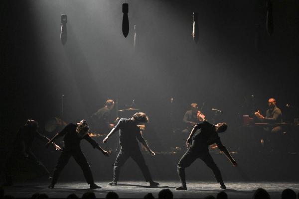 Ce Gernika par la danse est un manifeste dans le sens d’une évocation historique, là où Picasso manifesta par la forme artistique qui, en faisant exploser les cathédrales esthétiques, devint politique au-delà de la prise de position contre la terreur. Le collectif Bilaka, Martin Harriague et les trois (formidables !) musiciens sous l’égide du compositeur Xabi Etcheverry s’emploient plutôt à circuler sous un tapis de bombes. Ces engins de la mort descendent des cintres dans une lenteur toute en poésie et en frayeur, s’éternisant dans leur menace. Leur beauté paradoxale rencontre un autre instant suspendu, celui du danseur basque à la jambe levée, quand la pointe de la chaussure atteint la verticale et semble s’accrocher au firmament à la manière de la balle du jongleur. Mais ni bombes ni gravats ne se prêtent au jonglage, et il n’y en a donc pas dans Gernika.