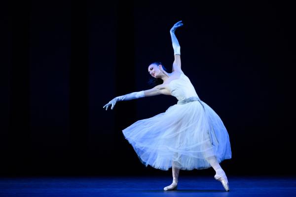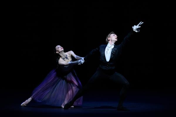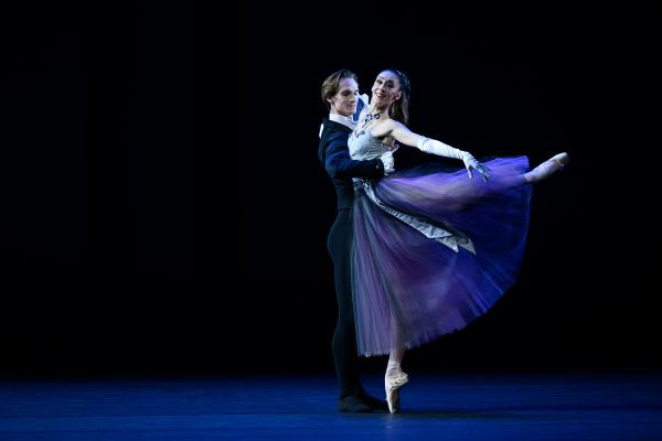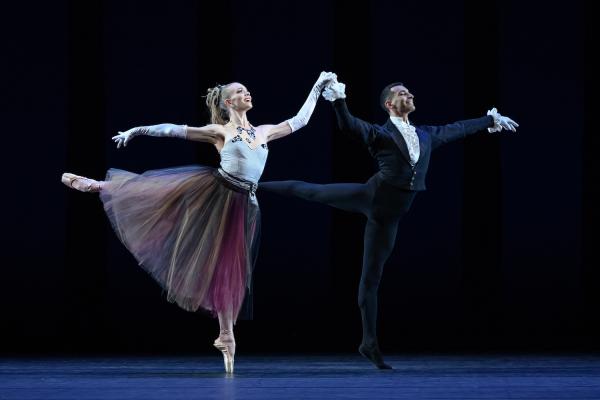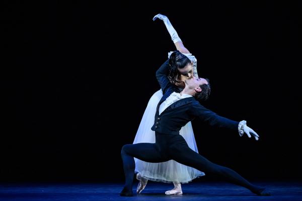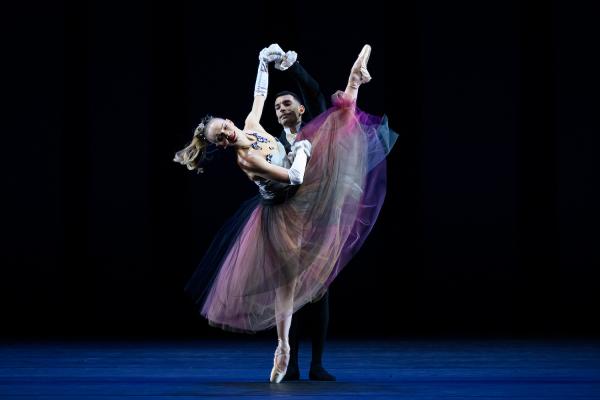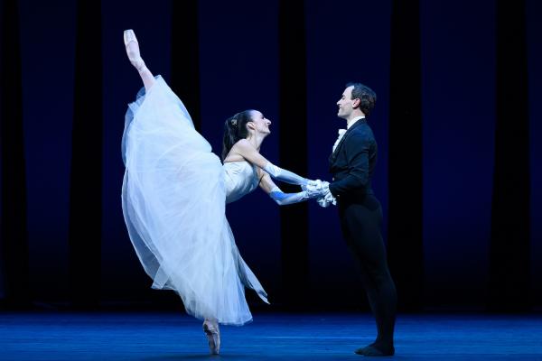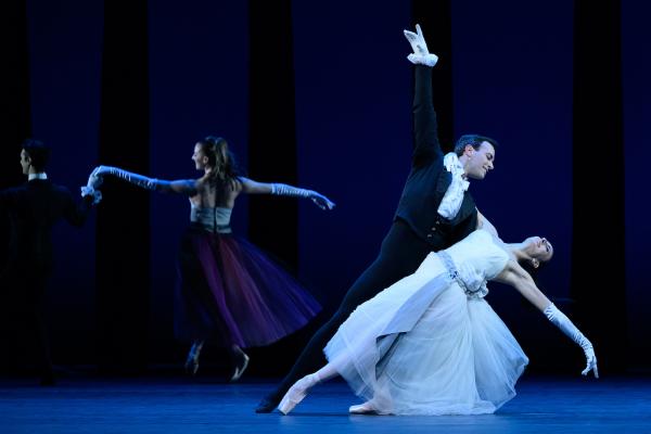 Après une première valse en trio d’exposition du thème pourrait-on dire, avec ces jolis tutus longs rose et noir, puis mauve orange et noir, signés Karinska et ces femmes très balanchiniennes gantées et bijoutées à souhait, chacune des sept autres opus va décliner son vocabulaire, leur donnant son expressivité singulière qui peu à peu tisse une narrativité d’ensemble. La deuxième est une variation sur les tours, la troisième sur les diagonales, la quatrième les développés, la cinquième les grands sauts etc. jusqu’à la huitième qui annonce déjà le caractère funeste de La Valse, en jouant sur la séduction d’une femme « fatale » très lyrique, avec des ports de bras qui prennent un maximum d’espace, dans une ambiance aussi élégante qu’inquiétante, très hitchcockienne, tandis que l’homme impressionne par ses tours pris un genou à terre. Commence alors La Valse, où la mort s’invite au bal tandis que les couples tournent et font des signes d’adieu comme s’ils dansaient à bord du Titanic avant la catastrophe, alors que le couple principal revient virevolter dans les méandres du désir. Pleine de trouvailles, comme ces grands jetés pris face au public, ces trios ou ces ensembles, qui tout en respectant le centre et la symétrie multiplient les points de vue, annonçant la révolution cunninghamienne, la chorégraphie ne lâche jamais la tension dramatique et la Femme en blanc est emportée par la Mort, tandis que le corps de ballet continue à valser et le monde à tourner.