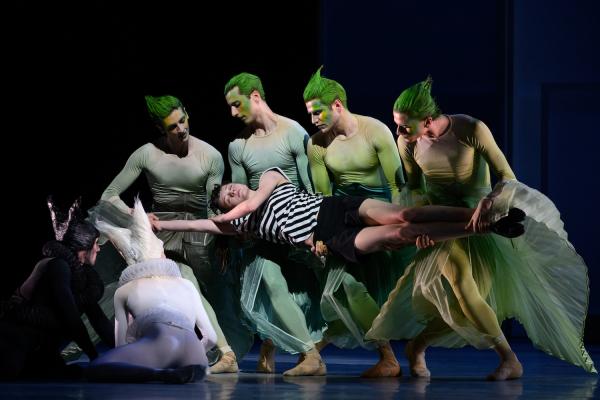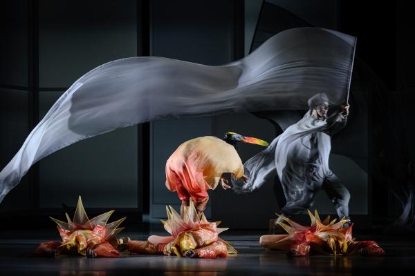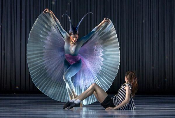 Entre rêve et réalité, merveilleusement illustrée par la délicatesse aérienne des costumes de Kaplan, la chorégraphie épouse les caractères des personnages-entités qui tissent cet opéra-ballet d’un nouveau genre. Jean-Christophe Maillot a eu l’intelligence de superposer dans son ballet de nombreuses approches qui fondent son originalité et sa subtilité. Par exemple, rendre à l’Horloge son esssentialité en ne montrant pas l’objet mais ses rouages avec force tours et manèges et une aiguille en académique et des tutus plateaux d’or et d’argent absolument magnifiques ; les Tasses, empruntent leur façonnage du tulle et leurs mouvements au cabaret… dans un joli clin d’œil à Colette qui n’hésita pas à danser au music-hall dans des tenues plutôt dénudées (que le public monégasque de l’époque sut reconnaître à sa juste valeur artistique !), les Pastourelle et Pastoureau du papier peint allient une danse aux accents baroques à des dessins de moutons sous acide signés Inès Reddah, les Feuilles arborent des ramures aériennes aussi irisées que les ailes des Libellules, et des mouvements presque martiaux ; le Chat et la Chatte ont la belle indifférence et la sensualité qu’il faut ; les Grenouilles la détente des cuisses qui va avec la cocasserie des coassements… Sans oublier le bel Ecureuil et sa jolie queue flottante ni Les Mathématiques et son exceptionnel chœur d’enfants de l’Académie de Musique et Théâtre Rainier III.