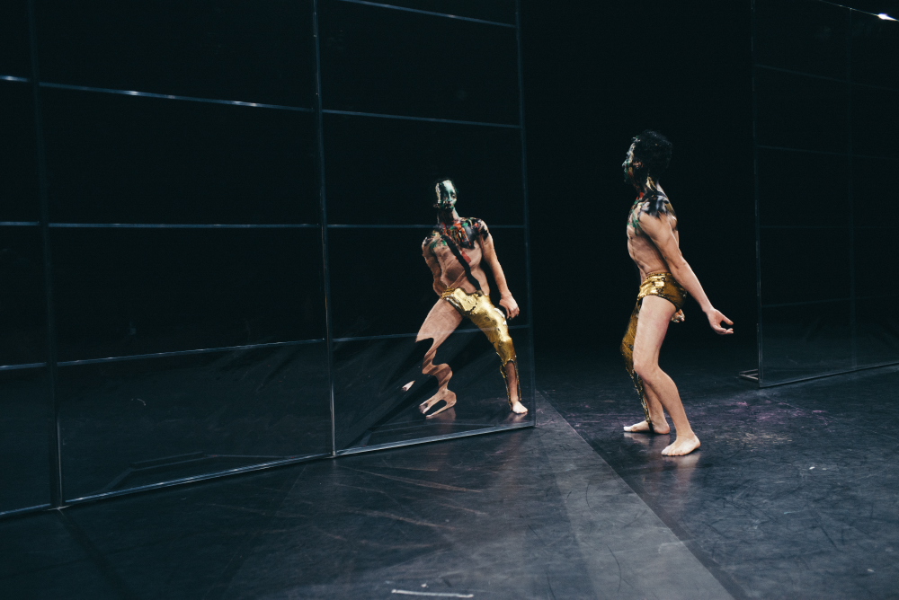 Le miroir est ici bien plus qu’une métaphore. Dès le début, il est là, en fond de scène. Avant même que la première danseuse entre, il renvoie au public une image brouillée, tel un tableau impressionniste, où ne restent que des taches de couleur diffuses. Quand les interprètes se relayent au cours du spectacle, le vacillement des paravents réfléchissants crée parfois l’illusion d’un sol tremblant sous leurs pieds. Tantôt réfléchissants, tantôt transparents, les parois peuvent aussi avaler un.e interprète comme lors d’une plongée dans l’eau. Tout est donc fait pour, littéralement, brouiller les pistes entre le réel et un monde indéfini, indéfinissable et incertain. Ce monde imaginaire et improbable n’est connu que de ces êtres dansants qui se transforment sous nos yeux, d’humains en shamans, apparemment dotés de capacités venant d’un monde parallèle.