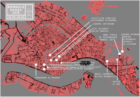 La Biennale de Danse de Venise 2015 placée sous la direction du chorégraphe Virgilio Sieni a fait le pari d’inclure la danse dans la ville, concevant la chorégraphie telle une géographie secrète dont les lignes et les circonvolutions venaient se juxtaposer au labyrinthe des « calle » des « ramo » des « sottoportegho » et bien sûr des canaux qui tissent les chemins de Venise.