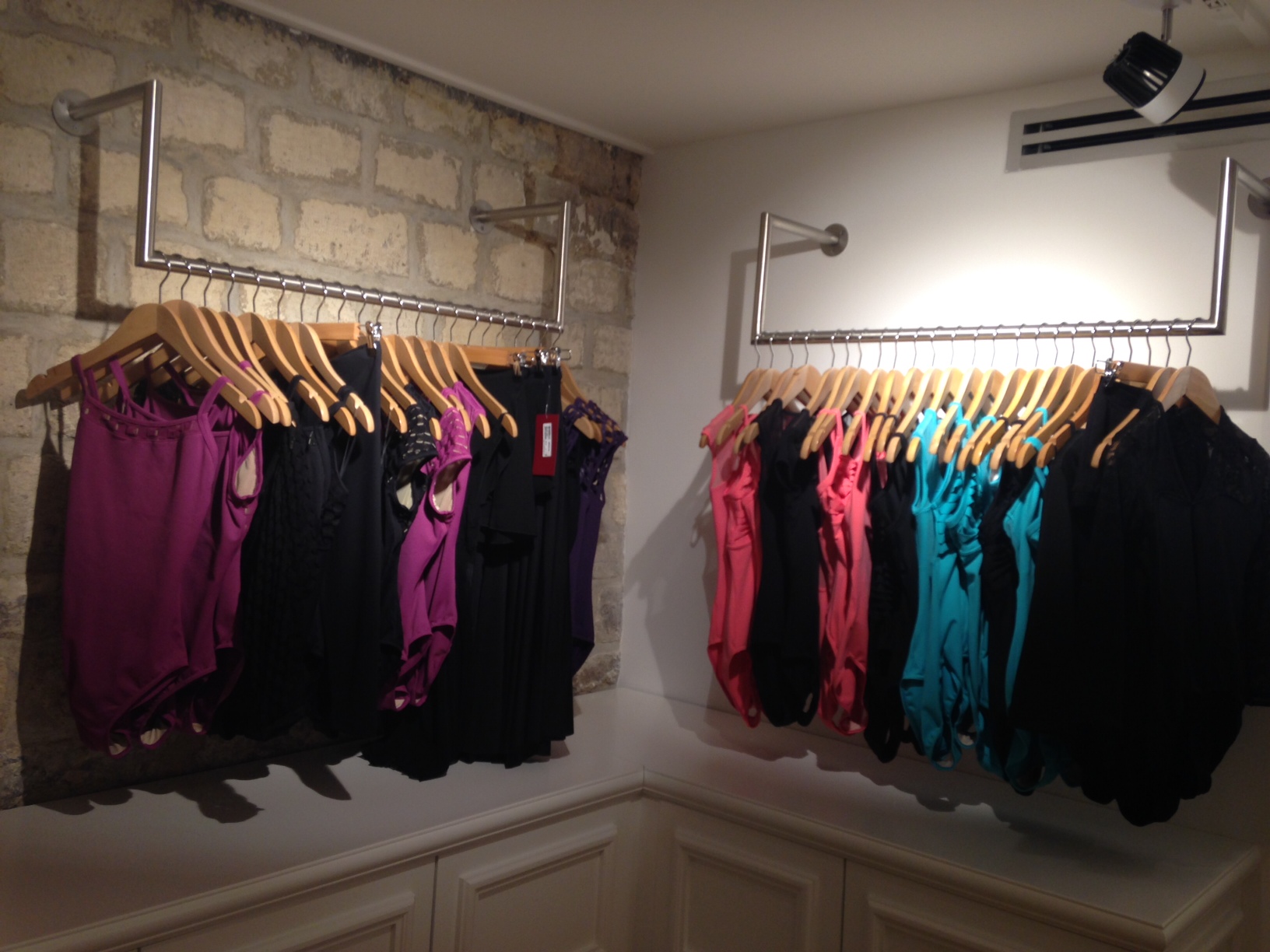 Dans deux alcôves attenantes, on trouve d’un côté, un rayon « enfants » qui contient tout ce dont nos apprentis danseurs ont besoin, et de l’autre, tous les vêtements qui conviennent à toutes les techniques autres : yoga, pilates, fitness avec des brassières, des pantalons souples, des shorts, des leggings, des tops…
