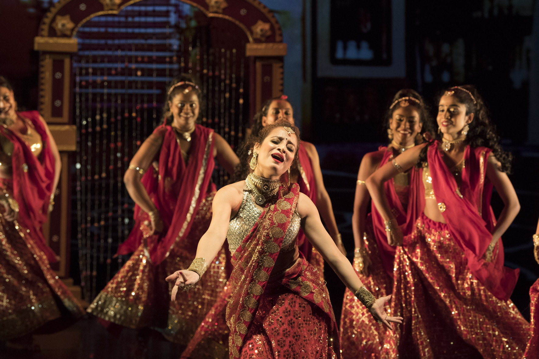 Pour assurer un rythme cinématographique des cuts, le spectacle fait logiquement appel aux projections, pour d’énormes tableaux peints dans un style à la fois photographique et poétisant, représentant tantôt la cour d’un palais, tantôt un jardin luxuriant ou bien un garage de réparation de voitures. Aussi le côté carte postale, indispensable pour charmer nos envies d’exotisme, est assuré sans tomber dans l’excès. Et puis, il y a les costumes, les danses et le chant, domaines où la scène peut a priori rivaliser avec le cinéma. Mais dans un scénario de film, la danse met les points d’orgue, libérant les émotions bouillonnantes attisées par la force de séduction et les aventures, heureuses et malheureuses, des protagonistes.