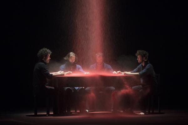 Le cadre s’estompe peu à peu et une large table autour de laquelle ils sont tous les quatre assis apparaît au loin. Cet instant semble calme alors que d’un seul coup des jets violents de poudre rouge tombent des cintres en provoquant d’énormes bruits. Du sang jaillit de nulle part les inonde avec barbarie.