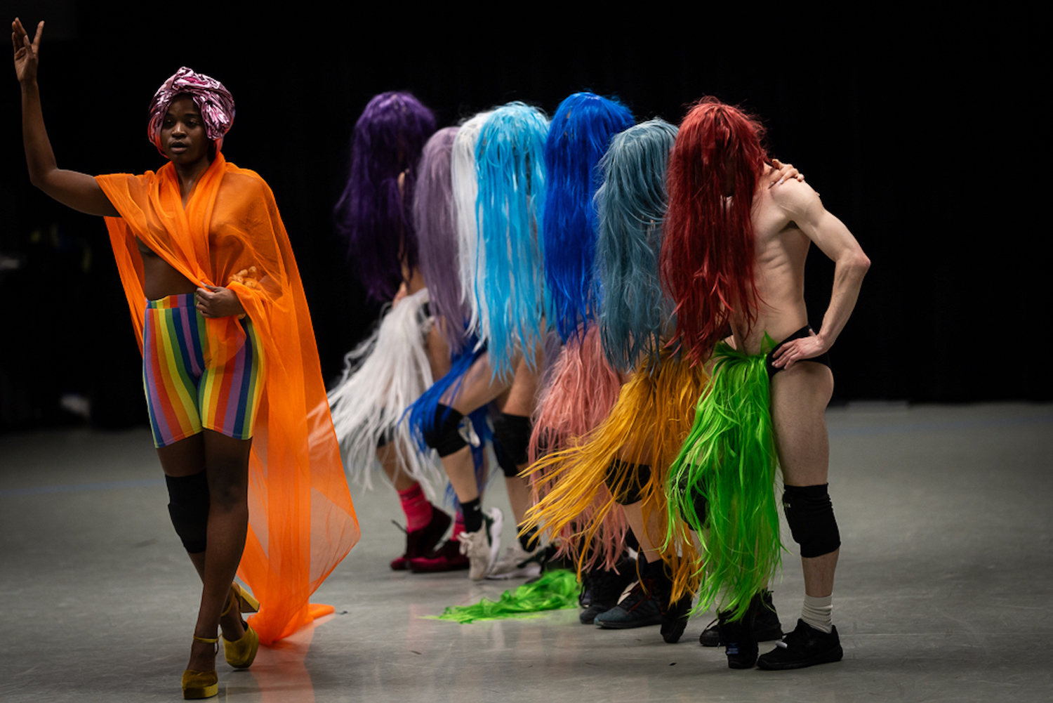 D'abord, une mise à nu des lionnes et lions de la soirée, au plus près du public. En off, la voix de Kae Tempest en chanté-parlé qui évoque dans sa chanson People’s Faces crise économique, pauvreté et oppression, mais aussi son inébranlable foi en l'humanité. Les quinze interprètes sont alors soumis à un ordre normatif qui prend la forme de duos ou trios réglés au cordeau et de combinaisons uniformes en noir et blanc, non sans évoquer les Beach Birds de Merce Cunningham. Mais déjà, le grotesque fait son entrée pour dynamiter la rigueur esthétique, quand les bouches sont contraintes, élargies et déformées, arborant un rose pétant. Contestation ou aliénation mentale ?