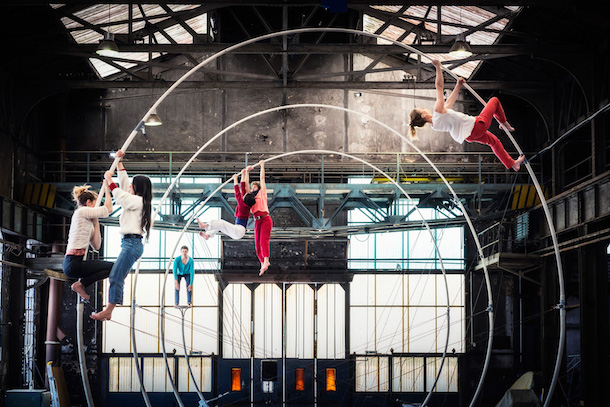 Structure fine et imposante de sept mètres de diamètre et dix-huit mètres de long, elle offre ses lignes courbes à cinq aventurières en suspension pour défier les lois ordinaires de la gravité. Mathilde Arsenault-Van Volsem, Fanny Austry, Anna Le Bozec, Mélusine Lavinet Drouet et Chloé Moglia, se livrent à toutes sortes de figures aériennes et non moins poétiques, en arpentant des lignes creuses, écrivant une chorégraphie circassienne tout en déliés.