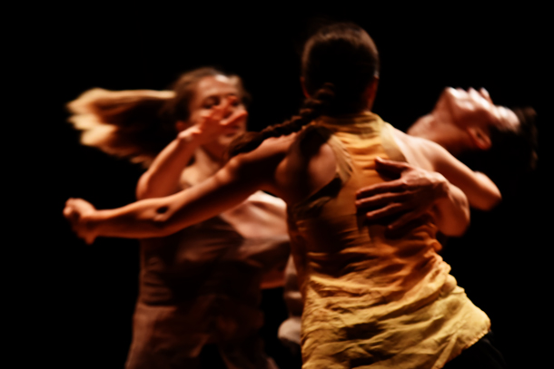 Donc d’une part Benjamin Mélia, musicien spécialiste du fifre et du galoubet qui, avec Guillaume Rigaud, va s’aventurer dans une manière de musique traditionnelle d’aujourd’hui. Cabrette et galoubet que l’électronique va modifier et amplifier encore… De l’autre les danseurs qui lentement se rencontrent, commencent à tourner ensemble, prennent un à un le solo, accélèrent, se saisissent. Le rythme force le pas, la danse le suit, l’excès s’instille. Les cheveux commencent à coller aux visages, les pas s’impriment dans la poussière d’ocre au sol et l’on y suit les traces des danseurs que les pas emportent. Les musiciens pressent l’allure pour suivre la transe qui monte jusqu’à une résolution dans une puissance enflammée. Les danseurs en sortent épuisés et le spectateur un peu groggy.