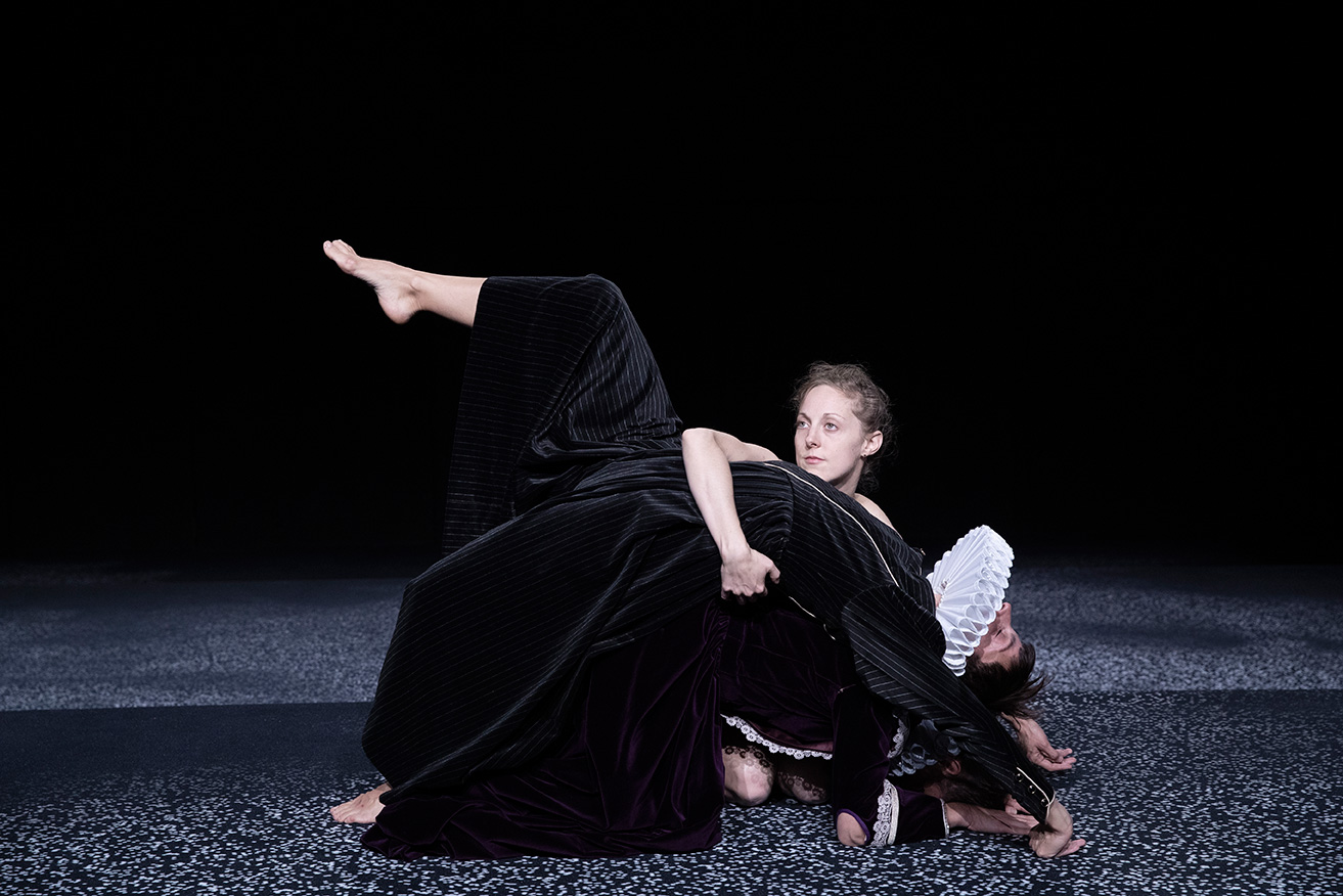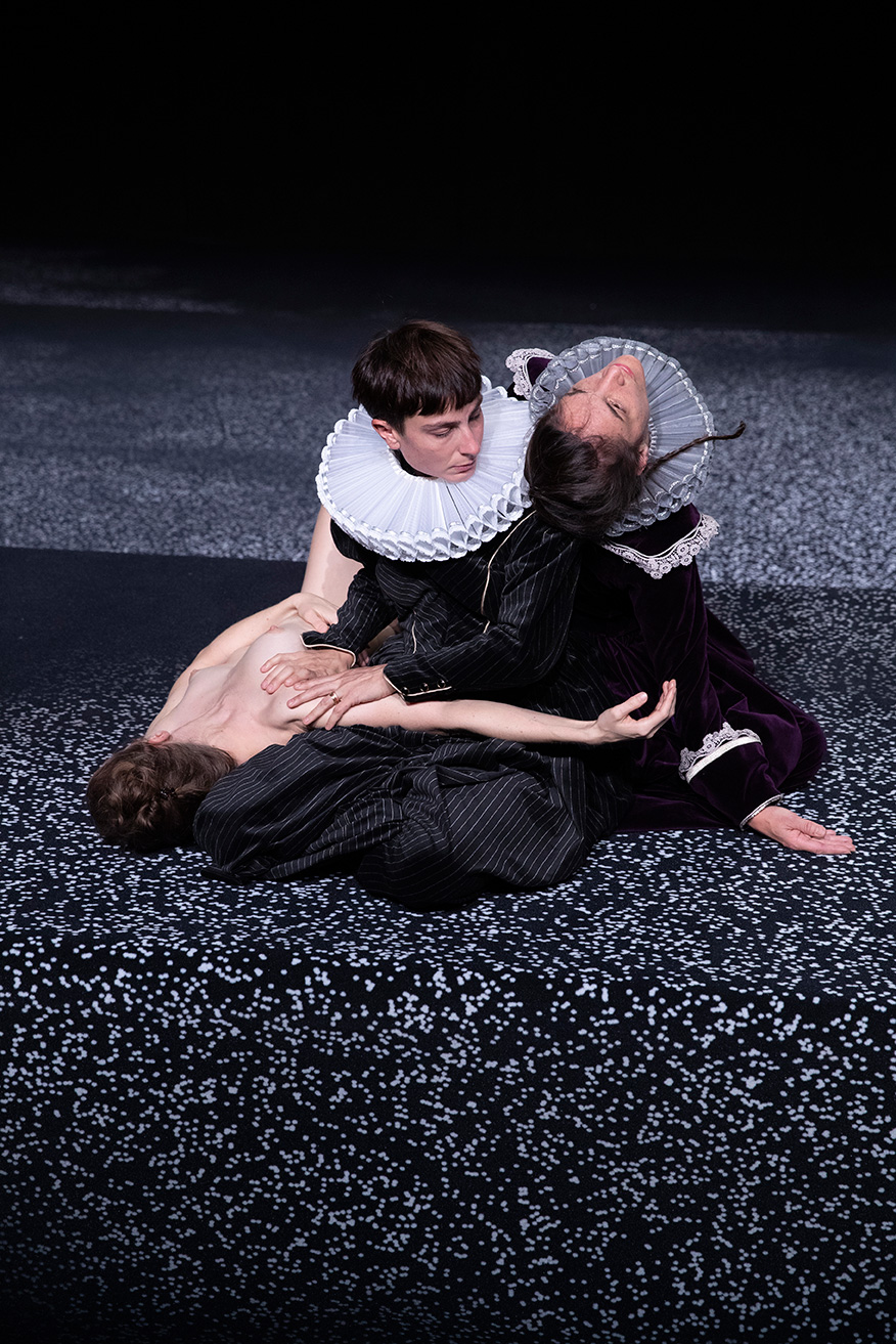 En robe de soie, richement ornementée et affublées d’une collerette, deux danseuses manipulent la troisième, dans son plus simple appareil. De pose en pose, de tableau vivant en tableau vivant, s’établit un dialogue entre deux styles et deux époques, entre Renaissance et baroque flamand ou élisabéthain, ou bien encore entre Rembrandt et Michel-Ange.
