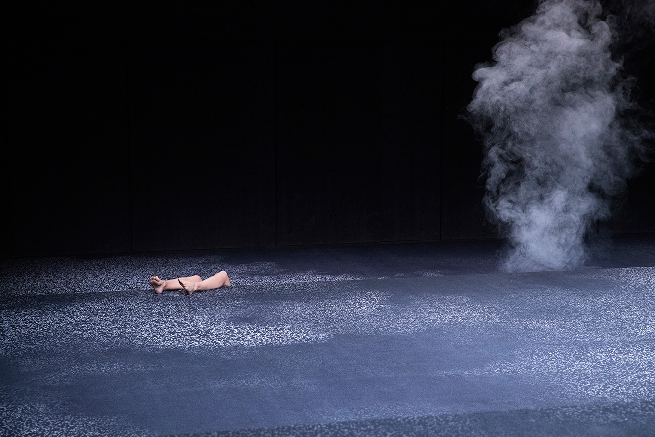 Au dernier tableau, Yasmine Hugonnet est couchée sur le dos, sur ce sol immense en trois niveaux, où les interprètes montent les marches quand elles se dirigent vers le public, sur une mosaïque accusant les traces des siècles qui l’ont traversée.