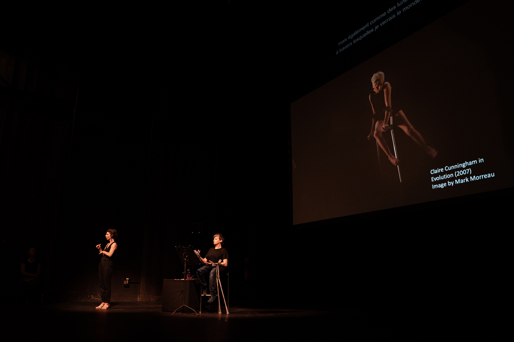 Car Cunningham est une personne qui dit ce qu’elle fait : Elle décrit en direct chaque image d’elle-même, chaque position de son corps, chaque mouvement. Pas besoin d’ajouter une audiodescription pour les déficients visuels, elle est intégrée dans le spectacle. Et pour les non entendants, il y a une traduction en langue des signes. Danse inclusive donc, mais pas dans le sens que Cunningham soit incluse dans une compagnie de danseurs « valides ». Ici, c’est inclusif pour le public.