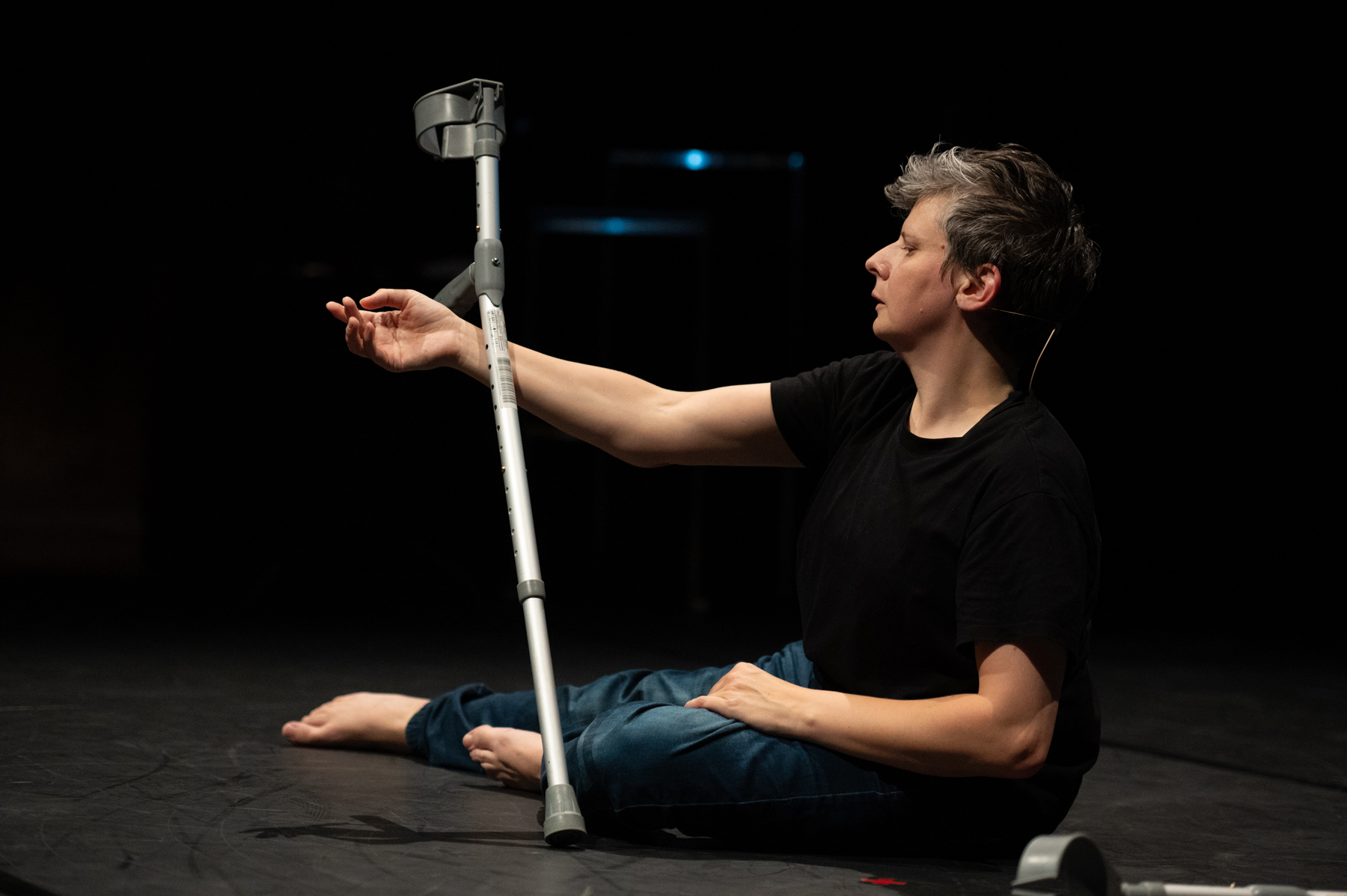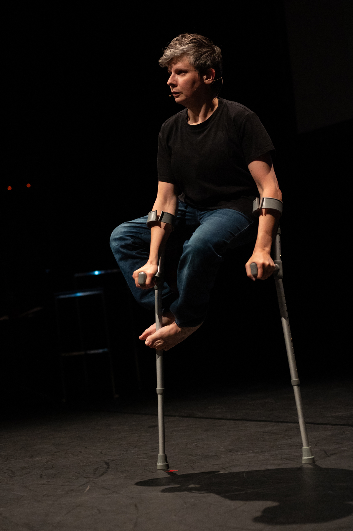Des béquilles comme partenaires organiques, pour une danseuse aux quatre jambes et sa danse auto-inclusive.