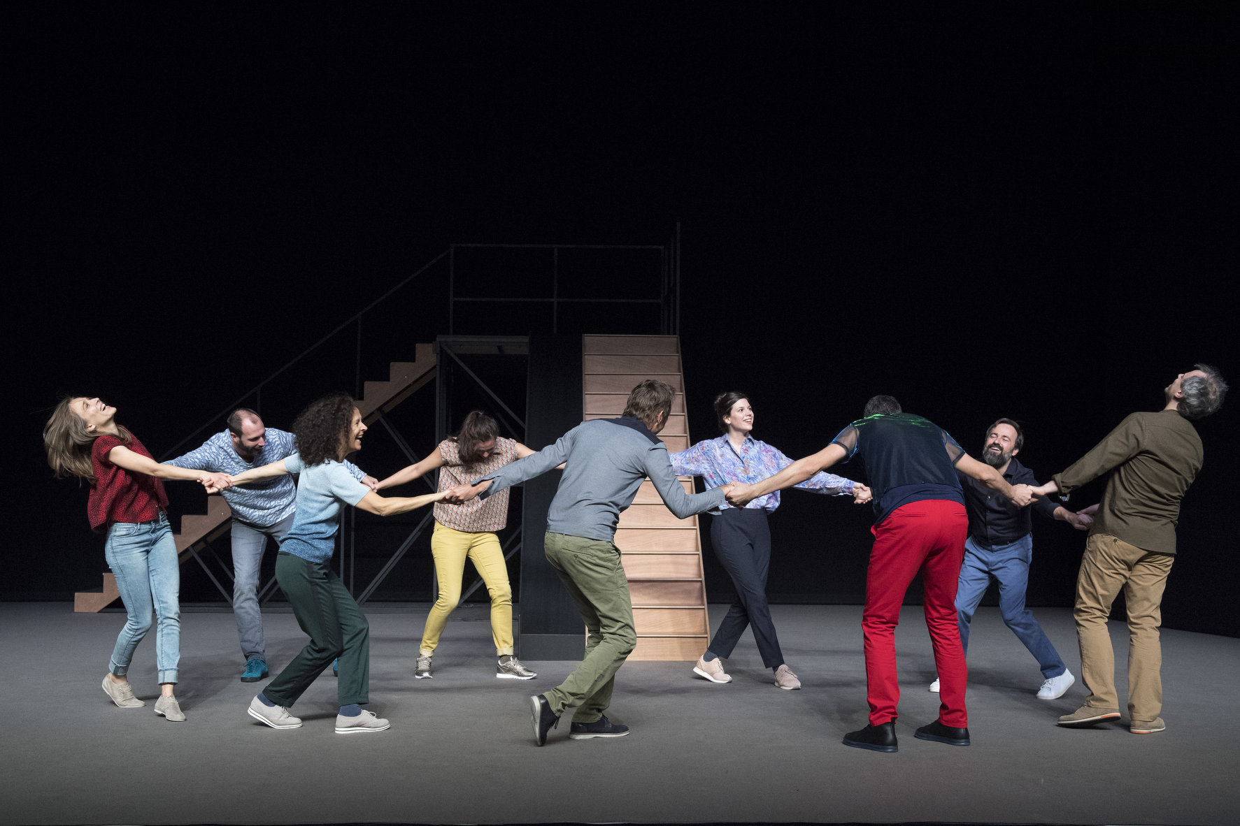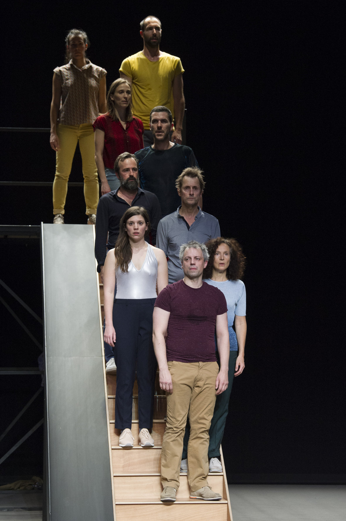 Un escalier et neuf Sisyphe émotionnels. Aussitôt montés, aussitôt redescendus. Aussi arrivent-ils sur le plateau, comme pour un casting. On s’aligne, on s’allonge, on se défie comme pour se disputer le rôle principal au grand cinéma des relations humaines.