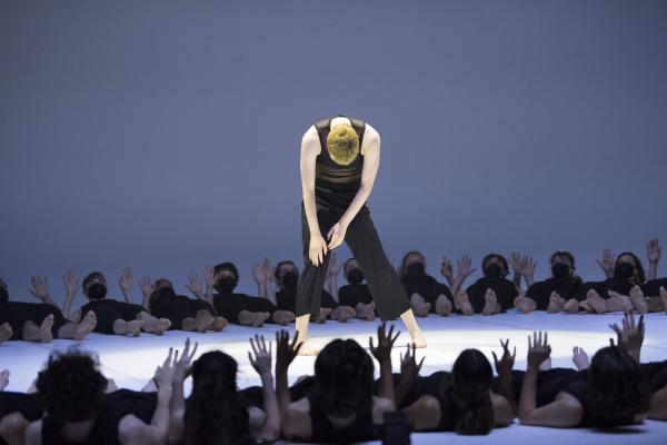 Colossus de Stephanie Lake, est d’abord un défi : conçu en pleine pandémie, la chorégraphe australienne ayant été interdite de déplacement – comme tous ses compatriotes – a donc imaginé de nouveaux processus de répétition totalement à distance avec 55 élèves du Conservatoire national supérieur de musique et de danse de Paris. Inutile de dire qu’il a fallu un travail littéralement colossal pour venir à bout d’une telle pièce en seulement quatre semaines via la plateforme Zoom, qui a non seulement été le théâtre de la recréation de cette pièce grand format mais a aussi servi à régler les éclairages, travailler les costumes, bref, monter tout un spectacle depuis l’autre bout de la planète. Et… c’et une réussite !