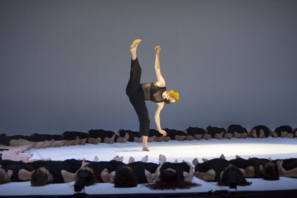 Allongés au sol et formant un cercle, tout commence, un peu sans surprise, par une démultiplication du mouvement, qui se propage d’un corps à l’autre, en onde ou en vague. Si l’effet est garanti, et assuré à la perfection par les élèves du CNSMDP, il n’est pas nouveau et a été amplement développé depuis Etienne-Jules Marey, notamment dans les chœurs en mouvement des années 1930, et plus récemment par Crystal Pite avec les danseurs de l’Opéra de Paris. Heureusement, Stephanie Lake a vite dépassé ce motif répercussif, en mettant tout le monde debout dans un espace courbe, qui bien que vaste, pouvait sembler saturé. Et c’est bien sur ce paradoxe que la chorégraphe a construit une danse chorale extrêmement inventive à la gestuelle originale, travaillant le groupe au corps.