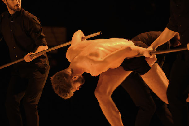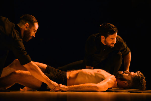 Davy Brun et son dramaturge Serge Gleizes n’ont pas exploré Calderon, mais Don Quichotte où Miguel de Cervantès mêle son expérience militaire à la tendresse d’un regard sur l’absurde. En suspension entre le réel et une fantaisie, quatre militaires s’exercent, courent, se portent ou se guident mutuellement. Ils font équipe, et peut-être ne font-ils qu’un.