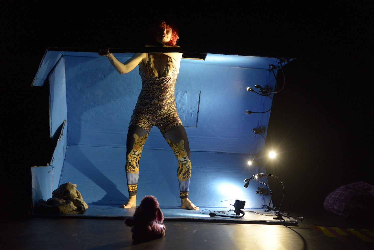 Des chiens aboient. Le petit train passe. Et deux chiens/chaussons en peluche rose sortent de cette boîte en carton et vont donner le ton de ce nouveau solo, radicalement hurluberlu, foncièrement engagé, absolument poétique. Quand enfin, Marta sort de son carton, elle apparaît dans une improbable tenue léopard ocellée et tête du félin sur les jambes, le tout agrémenté d’un boléro en fausse fourrure fuschia. Il y a du Toréador et de l’Espagnolade dans l’air, comme autant de clichés hispanisants, tandis que bras et jambes esquissent les poncifs du flamenco. Avant que tout ça ne vrille dans une gestuelle complètement folle, sur des rythmes vaguement militaires ou attrape une grappe de raisin descendue des cintres, mi-Faune, mi-Bacchus, tandis que se déplie le carton sur lequel apparaissent des petites loupiotes éclairant un fond bleu ciel comme autant d’étoiles. Entretemps, elle chante – extrêmement bien – puis disparaît sous le carton tandis que Charles Trenet entonne La Mer.