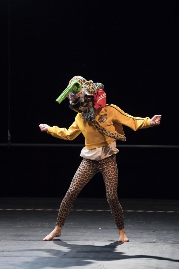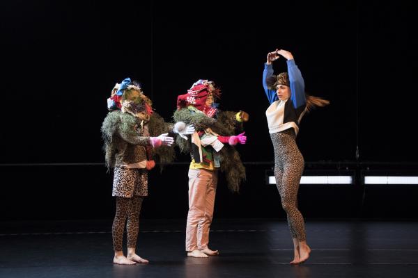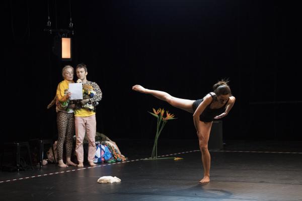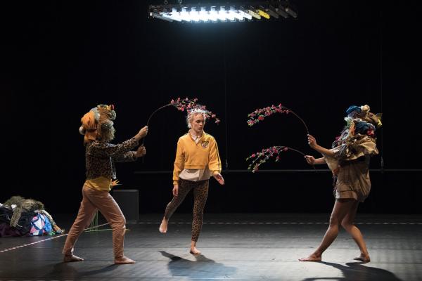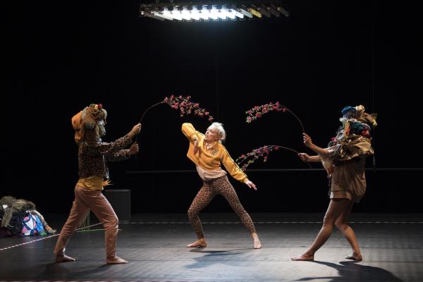 Le cadavre exquis est à l’origine un jeu inventé par les Surréalistes. Outre que le résultat est généralement hilarant, l’approche théorique rattache le cadavre exquis à une automatisation de l’écriture, afin notamment de désacraliser la figure de l’auteur démiurge, et d’attribuer l’acte créatif à une dynamique collective. En 2012, la chorégraphe Joanne Leighton s’était saisie de ce procédé pour créer Exquisite Corpse, associant la phrase de 57 de ses pairs à la sienne. Seule contrainte : les dernières dix secondes de chaque séquence devaient être transmises au chorégraphe suivant qui en faisait son point de départ. Les intervenants avaient rivalisé d’invention pour transmettre leur phrase : vidéo, images, textes, consignes, ou, bien sûr, transmission directe dans le studio. Aujourd’hui, il s’agit de reprendre cette partition hétéroclite de 58 minutes écrite par 58 chorégraphes pour la transformer, à la manière d’un palimpseste, pour trois interprètes. Joanne Leighton a également revu toute la scénographie, sorte de patchworks vestimentaires colorés, qui donne à la pièce un tour étrange et un peu baroque.