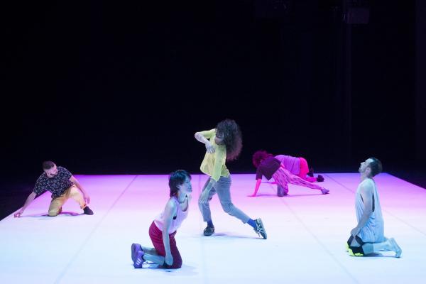 Grosso modo, l’opus se partage en cinq parties difficiles à démêler par la simple observation de l’écoulement gestuel, n’étaient les changements d’éclairage, de tempo et même, n’ayons pas peur des mots, de temporalité. Les costumes sont « casuals », « sport », « sans façon » ; ils affichent les couleurs les plus gaies. Filles, en minorité, et garçons exhibent pantalons de survêt, marcels, maillots de corps, shorts, baskets griffées – dont une paire d’Adidas, vert vif flambant neuf, crissant sur le tapis de sol. Les nappes sonores sont électro. La lumière a été conçue par un des excellents éclairagistes de la scène contemporaine montréalaise, Alexandre Pilon Guay. Ses variations n’ont rien d’expressif ; elles obéissent à une logique propre.