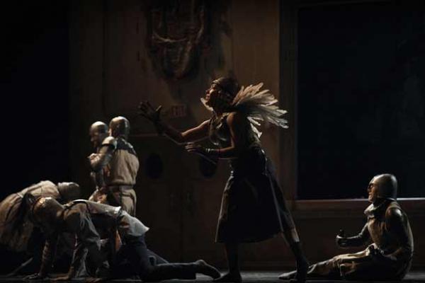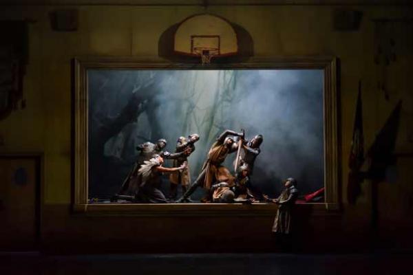La chorégraphie l’est tout autant et semble révéler cette étrangeté à habiter un monde dont nous ne savons à peu près rien. Aussi absurde qu’imprévisible, aussi fuyant que rigolo. De dislocations en démantibulations, de désarticulations en désagrégations, la pièce se détraque, et l’Assembly Hall se désassemble pour virer à la « Fête de la Quête » elle-même qui s’ouvre sur la petite scène qui fait décor, masquée par un rideau, et découvre une forêt perdue dans la brume, ou un magnifique tableau creusé d’ombres digne d’une peinture hollandaise. Là se déroule alors le fameux conte mediéval qu’il faut rejouer/réactiver sans cesse pour ne pas l’oublier. Et même s’il n’en reste qu’un fragment tiré du néant, ce fragment nous rappelle que l’humain ne cesse de chercher des réponses, de s'interroger sur ses origines mêmes, comme perdu à nous-mêmes, en prise avec un monde qui nous dépasse, peuplé de fantômes et de récits bizarres, où s’agitent nos peurs. Façon d’affirmer aussi, peut-être, que seule la fiction, ou un imaginaire fort nous permettra de traverser nos angoisses et nos fragilités. Comme le ferait un « Ordre bienveillant et protecteur » ?