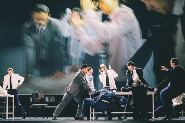 Tout au long du triptyque, la danse transcende les disciplines. Les corps, virtuoses et habités, deviennent le support d’un discours qui échappe aux mots : tantôt organiques, tantôt désincarnés, ils portent en eux le récit d’un monde qui vacille. La direction de Pite, d’une rare précision dramaturgique, donne à voir une gestuelle qui dialogue avec le texte et la scénographie sans jamais s’y subordonner. Elle travaille les unissons à foison, parfois décalés, les effets dominos, parfois décuplés par la vidéo, les sauts silencieux, les allongements et les accélérations dans une fluidité étonnante. Les groupes pris dans des emportements chaotiques, des courses qui se décomposent, des arrêts sur image, pour créer une chorégraphie d’une redoutable efficacité.