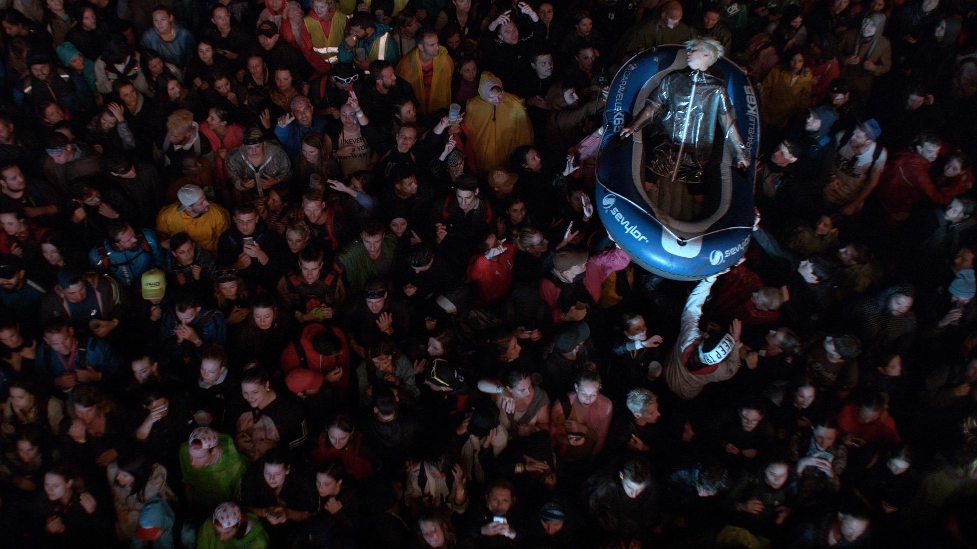 Des concerts eux-mêmes, nous n’en saurons rien, le film se focalisant sur l’avant et l’après, sur les a-côtés, sur les spectateurs et non les acteurs. À cet égard, les acteurs et danseurs distribués par (LA)HORDE se limitent dans le cas qui nous occupe à faire de la figuration, à se fondre, autant que faire se peut, dans la foule de jeunes gens et jeunes filles composant le public. La fille aux cheveux peroxydés, debout sur un canot pneumatique, est portée en triomphe par le flot humain pris en vue aérienne. D’ailleurs, cette année-là, en 2018, apparemment, la Patrouille de France avait survolé le site d’un festival à l’issue duquel un feu d’artifice avait été tiré.