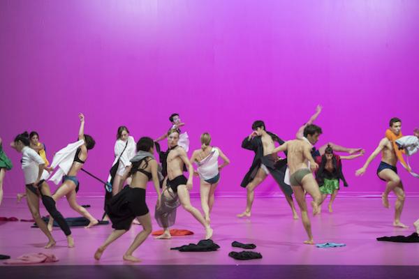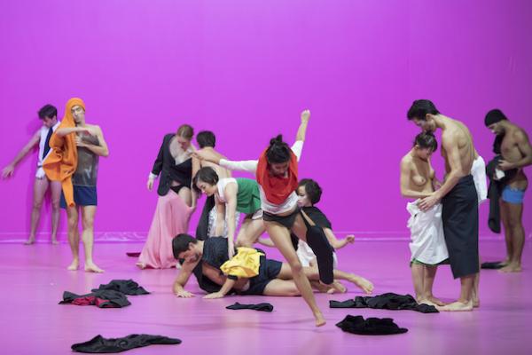 Il n'y a pas que le tee-shirt du chorégraphe. Sur le plateau, tout commence par une histoire de costumes (auxquels Gutierrez lui-même a prêté la main). Sur le fond outageusement fuchsia du tapis comme du fond de scène, ces costumes sont de couleurs acidulées et souvent vives. Ils sont de découpes dépareillées, abracadabrantes, combinant jambe short et jambe pantalon par exemple, avec voiles noués au jugé, manches qui font col, revers d'épaule sombrant en fouillis de traîne, et pourquoi pas zizi ou sein à l'air. Fin de fête décadente.
