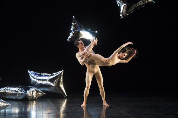 1968, on le retrouve à nouveau, plus discrètement, quand le spectacle commence vraiment. 1968 : date de la création de RainForest, par Merce Cunningham (lui-même alors à l'orée de sa cinquantième année). L'image scénographique de cette pièce est restée fameuse, faite d'un libre ballet de ballons flottant dans l'air, en forme d'oreillers remplis d'hélium, que le chorégraphe avait emprunté à Andy Warhol. C'est toute une époque, baignée dans les contre-cultures effervescentes d'une New-York qui n'avait pas encore connu la terrible crise du sida (on y reviendra plus loin).
