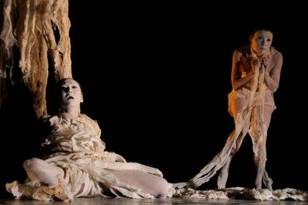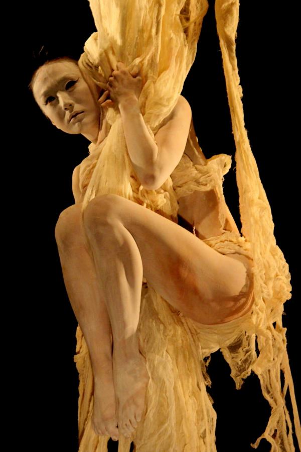 C’est souvent vrai aussi pour les autres interprètes, dans une animalité variée (chenilles, poulpes, oiseaux) incarnée ou figurée. Mais ce sont les créatures physiquement ou moralement monstrueuses qui dominent Asura. Car le butô peut réagir à l’actualité, même s’il le fait à sa façon. Asura est une pièce pour la paix, inspirée des images de la décapitation d’un journaliste japonais par l’IS. Un choc, et un renvoie aux Asura dont l’origine se trouverait en Iraq, selon Muku qui renoue avec la vocation antimilitariste du butô à sa naissance.