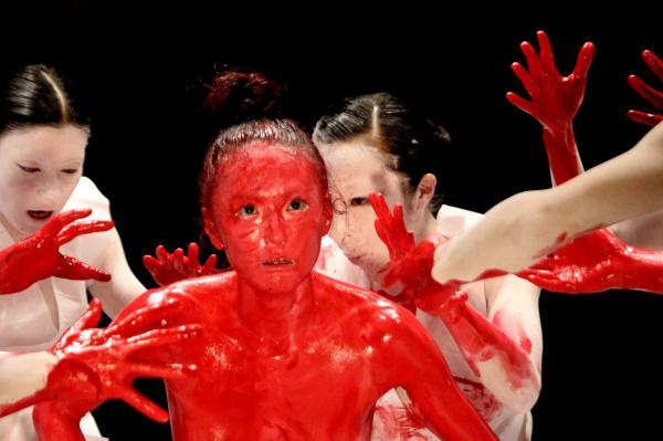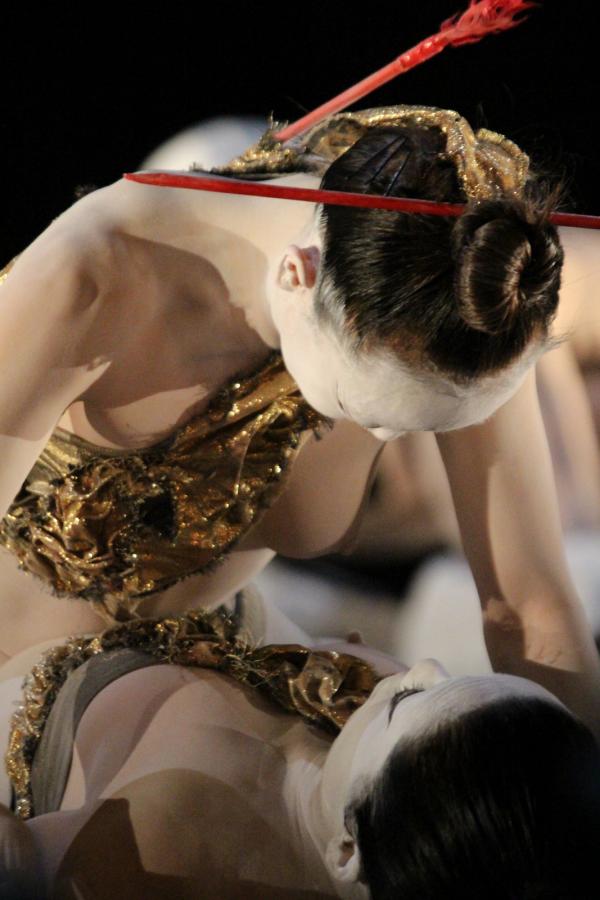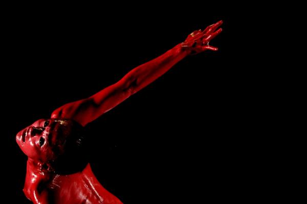 Dans le tableau qui introduit le solo rouge, d’autres Amazones offrent à Muku une série d’empreintes et de caresses. Presque un massage. Voilà donc le bien-être et la fascination sanguinaire des humains unis dans une seule image, comme le butô sait si bien allier terreur et beauté.