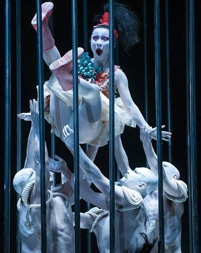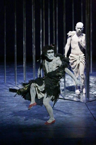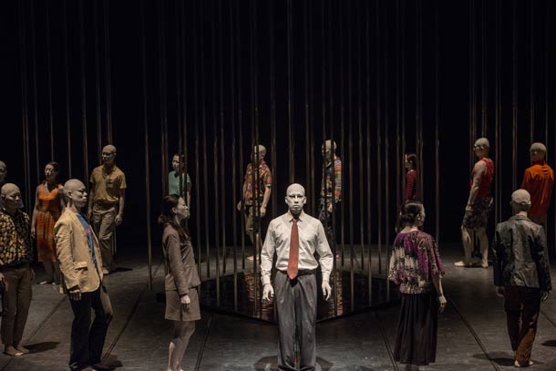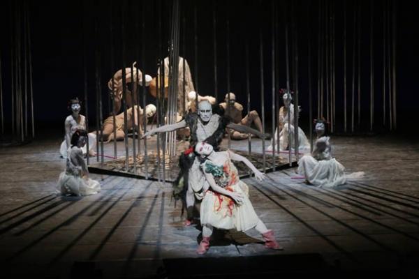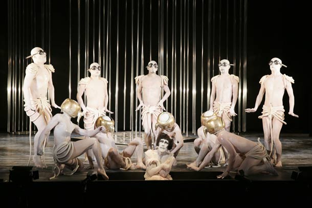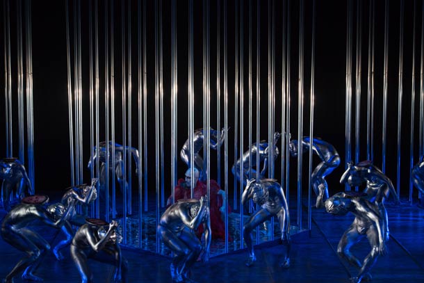 Mais il faut bien remplir le format et le plateau. D'où les vingt-deux danseurs, d'où l'énorme scénographie, aussi puissante que limpide. Des tubes métalliques délimitent cinq petits espaces (un carré et quatre cercles), sculptures et cages à la fois. S'y ajoutent, comme autres formes d'art plastique, les costumes, les corps peints en argent et autres uniformes-carapaces faites de cordages et de théières. Mais dans l'ensemble, la charte chromatique nipponne (blanc/rouge/noir) est respectée de façon exemplaire.
