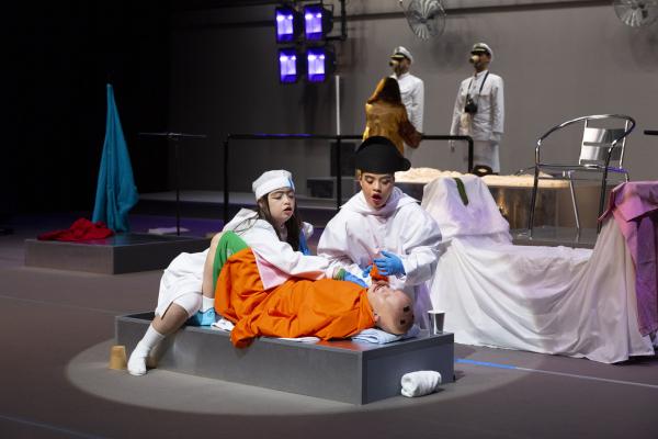 Freitas surtout, qui reproduit la géométrie formelle de Mal – Embriaguez Divina, plaçant barres, podiums, lits, cubes et autres objets régulateurs dans un espace ultra-structuré, où l’on se pavane en arborant des uniformes fantaisistes. DansÔSS, elle prolonge l’univers très formel de Mal…,inspiré du roman Le Château de Kafka [Lire notre critique] comme les mouvements d’automates qui marquent sa pièce précédente, De marfim e carne – as estátuas também sofrem [Lire notre critique] et en reprend l’architecture spatiale rigoureuse et les uniformes.