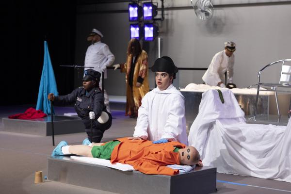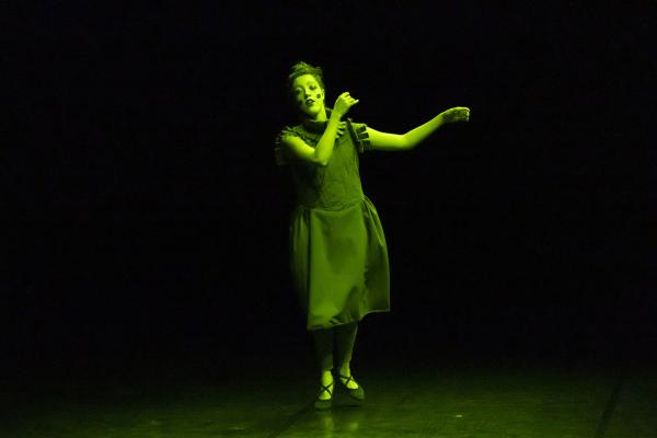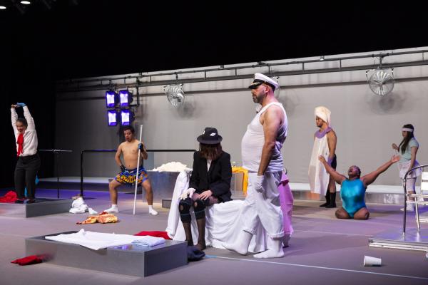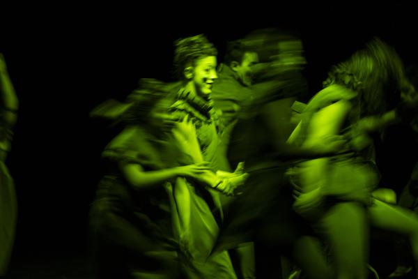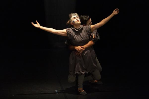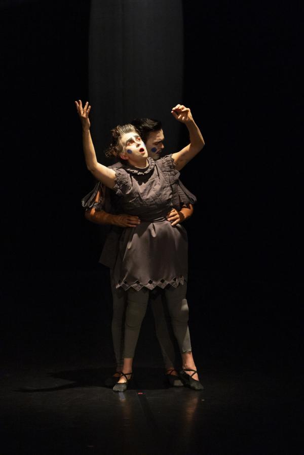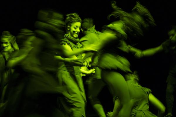Doesdicon est un beau travail formel qui doit autant à la rigueur d’Icosahedron (2011) qu’à la douce folie nocturne de son Onironauta. (2020). Le titre est ici une anagramme d’escondido : caché. Et alors qu’elle expliquait en amont qu’il s’agissait de braquer quelque projecteur sur des personnes que la société préfère cacher, la pièce avec son ambiance nocturne fait précisément cela, les transformant en des sortes de Petrouchka ou autres personnages automates. Forcément ils sont debout, ce qui exclut de la pièce la formidable Mariana Tembe, celle qui vit sans jambes mais entraîne dans Blasons toute la troupe dans une traversée du plateau, à même le sol.