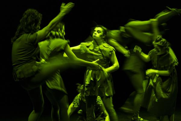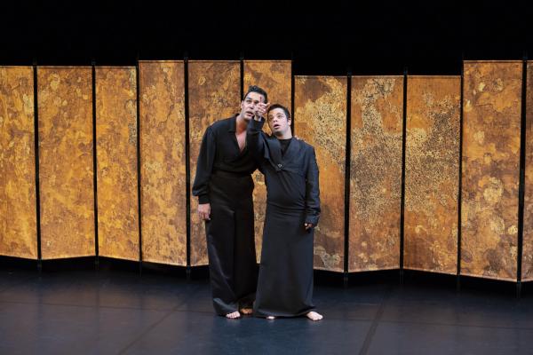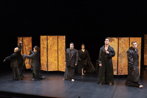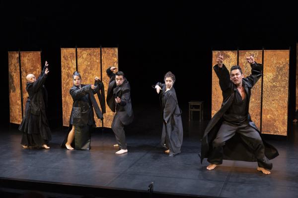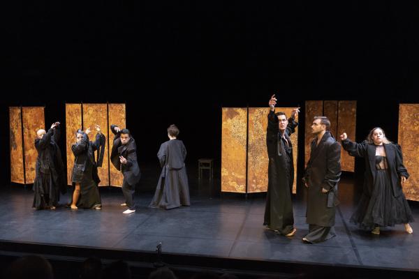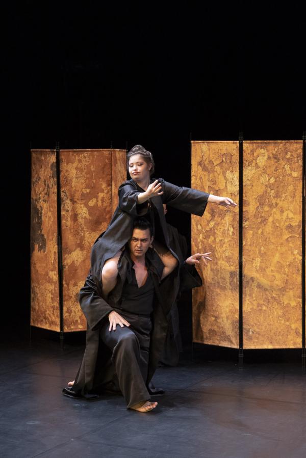 Et on les sent extrêmement libres, en redorant leur blason de la sorte, alors qu’en fond de scène, un paravent doré leur permet un jeu facétieux d’entrée et de sorties. Là, ils prennent le pouvoir de tout : de leurs corps, de la situation et du regard sur eux-mêmes. C’est eux qui commandent, c’est eux qui commentent. Par le fou rire, par le chant, par des gestes défiants en direction du public, en mimant des cris ou des vomissements… Leur unité fait leur force et chacun est libre de s’exprimer à sa manière. Dans leur tuniques noirs ils sont en même temps prêts à entrer dans l‘univers de Carvalho qui les embarque dans un des voyages nocturnes dont elle a le secret.