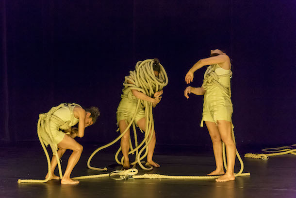 Avec The Discontinuation of an echo, Sol Bilbao Lucuix joue sur la notion d’équilibre et du vivre ensemble avec trois danseuses qui sont chacune maintenues par une corde et sont liées ensemble par le centre. Il y a celle qui veut être la plus forte, l’autre qui désire commander et celle qui subit. Les jeux se perdent dans des méandres où les actions de l’une vont influencer l’autre et vice versa. En trio, duo ou seule, elles dessinent les codes de la société dans un langage dansé basé sur les fragilités humaines.