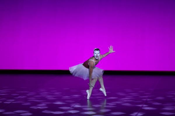 Idolâtrie et ironie cohabitent dans The Dancer(s). Et cela, dès le début du show, avec la prestation clownesque de Nicolas Lazzaro, performance de danseur mais également de mime qui sollicite a priori, avant que nous n’ayons rien vu, nos applaudissements – obtenus aisément, la salle étant pleine et prête à craquer. Le gag à répétition de « L’Air des bijoux » tiré du Faust (1859) de Gounod (voir), diversement traité, rythme, si besoin est la soirée, se référant à la Castafiore d’Hergé. On remarque que le playback est utilisé à plusieurs reprises comme le faisait d’ailleurs Système Castafiore, la compagnie de danse contemporaine de Marcia Barcellos et Karl Biscuit. Un gag efficace résulte du numéro avec, d’un côté, les danseuses exécutant à la perfection les mouvements d’ensemble du ballet blanc et trois costauds en tenue de basketteurs contrastant sinon contrariant le déroulement chorégraphique.