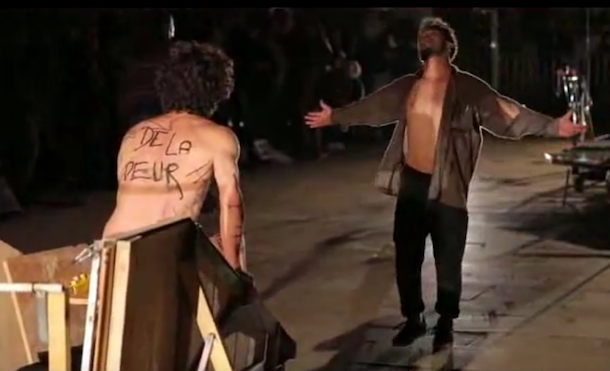 Mais le mélange de métaphores et de réalisme a ses limites. S’il est vrai que les corps en puissance sont à la hauteur de la rage qui peut habiter les SDF, la situation spectaculaire est contre-nature. Le public « inclut » les « exclus », et le paradoxe cache bien plus qu’un vilain jeu de mots. En spectacularisant la situation des clochards, le dispositif imaginé pour Des Vils est aux antipodes des conditions réelles, de la lutte pour la survie au quotidien.