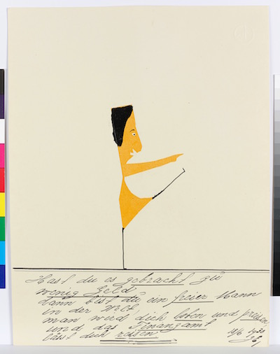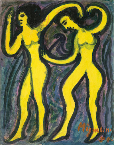 Sont également exposés ses dessins à l’audace fulgurante, véritables chorégraphies plastiques où les figures géométriques du cercle et de la courbe semblent à la jonction de l’œuvre picturale et de la notation de ballet. Leur force, et l’aura de leur auteur, éclipsent quelque peu les autres pièces pourtant intéressantes exposées dans la salle, qu’il s’agisse des travaux du pédagogue Fernand Deligny ou des toiles du peintre espagnol Miguel Hernandez.