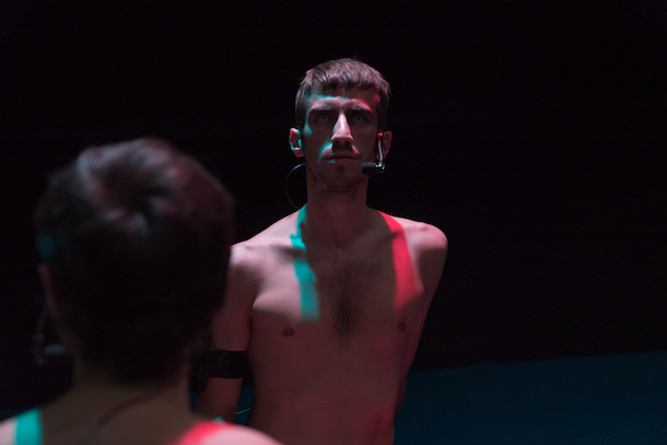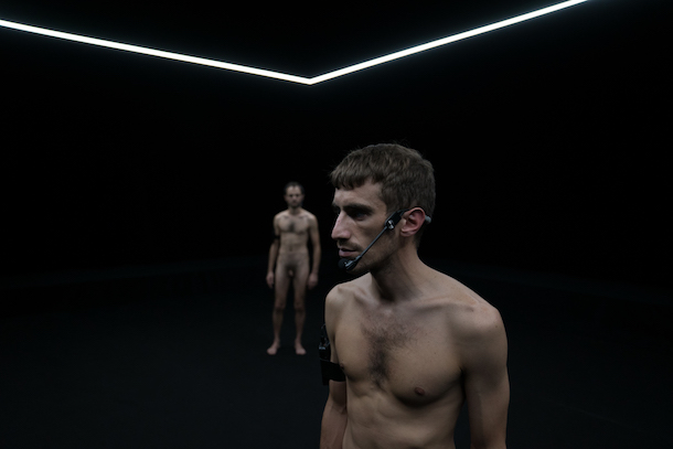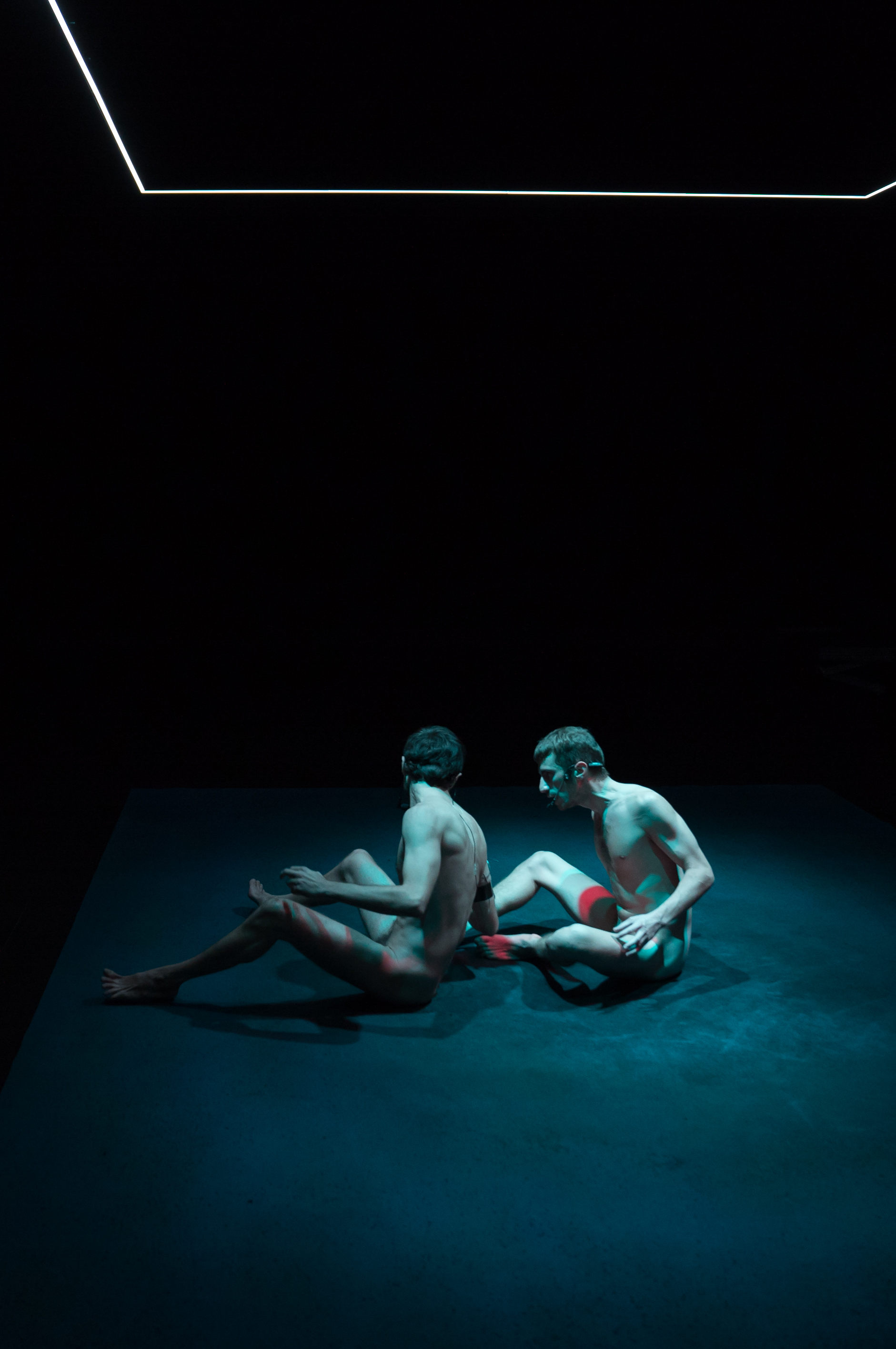 A vrai dire, on ne pigeait rien à ces quelques lignes opaques, évoquant des "pratiques médicales alternatives de la microscopie dite en champ sombre", censées nous éclairer sur une prestation scénique commençant plutôt mal. Soit deux superbes jeunes hommes, assis au sol, intégralement nus sous éclairage blâfard, mais quasi immobiles, avant tout engagés dans un échange verbal ininterrompu dans la langue de Shakespeare. C'est pas qu'on y comprenne goutte. Mais c'est qu'il y faut consentir un effort spécifique, et qu'alors celui-ci entre en tension contradictoire avec l'attention qui reste à porter à la dimension non verbale de la performance. Il faut plus ou moins choisir. C'est une position agaçante. C'est fatigant.
