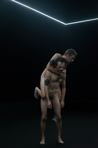 Au final de la pièce, il ne se sera pas passé grand-chose de plus qu'un microcosme duel de la phylogénèse. Les deux hommes finiront, très progressivement, par se retrouver en position debout. Mais c'est transcendant. Ils ne s'en contentent pas. Cette grande érection se poursuit, par la patiente ascension de l'un, jusqu'à se hisser debout, sur les épaules de l'autre. La configuration scénique est étroite, les spectateurs sont très proches, et la situation se fait vertigineuse, en contre-plongée.