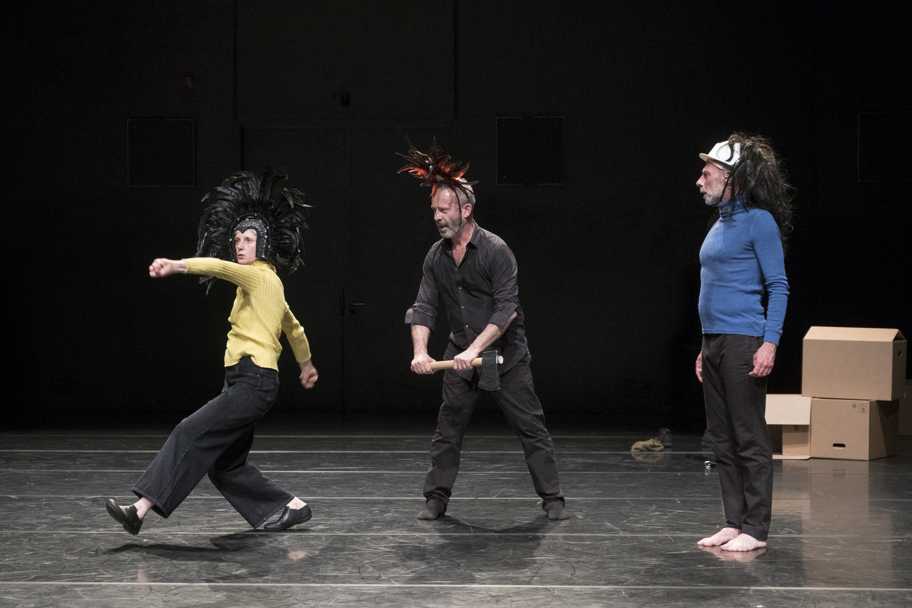 Tout ce qui leur avait servi à se déguiser dans la seconde partie de leur trio - les perruques, coiffes à plumes et autres costumes à fourrure - partirent dans les boîtes et puis, dans les coulisses. Resta un plateau vide et propre, après un spectacle évoquant luttes politiques, révoltes sociales et une jeunesse italienne qui voulait en finir avec le règne des clans militaro-industriels.
