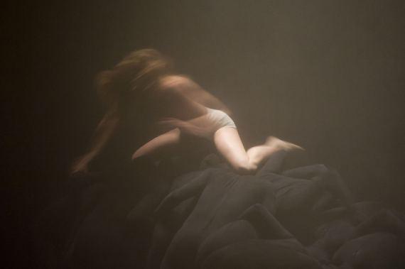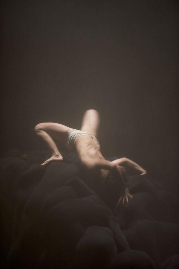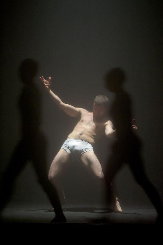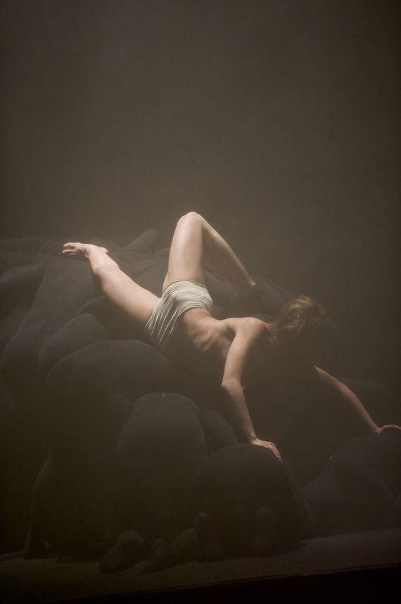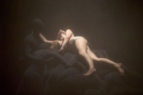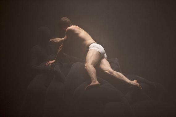 Dans la pénombre, on distingue un homme allongé, souligné par un éclairage lunaire renforçant l’effet de mystère qui plane autour de ce nouvel Endymion endormi qui nous rappelle inévitablement la peinture de Girodet. D’ailleurs, les peintres du Romantisme seront bien souvent convoqués dans cette pièce, où le jeu d’une lumière blafarde soulignant le dessin musculaire évoque tour à tour Géricault, Delacroix, ou Goya, où certains mouvements évoquent des descentes de croix, et des atmosphères à la Caspar Friedrich. Mais laissons-là ces sources d’inspiration picturale, car si elles traversent l’esthétique d’Élégie elles n’en résument pas pour autant le propos.
