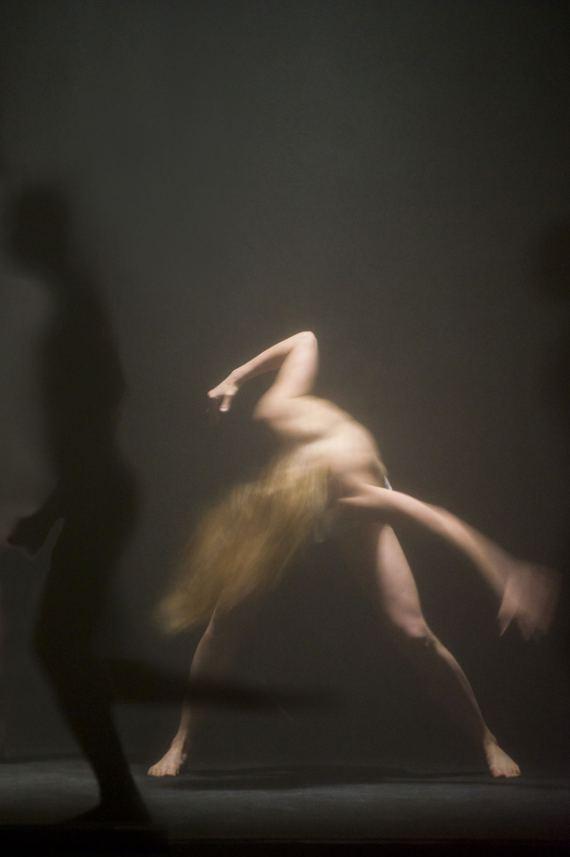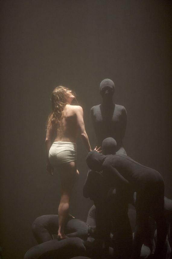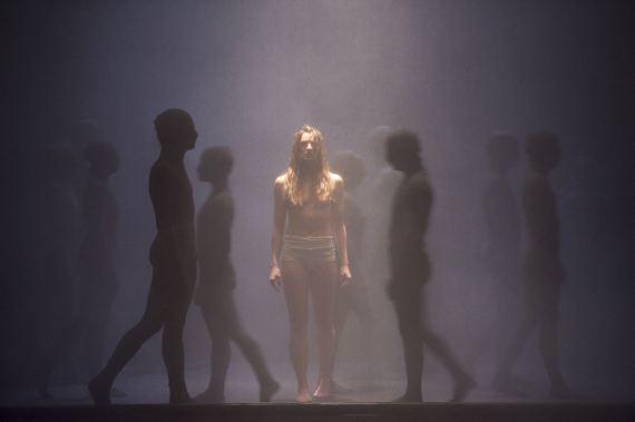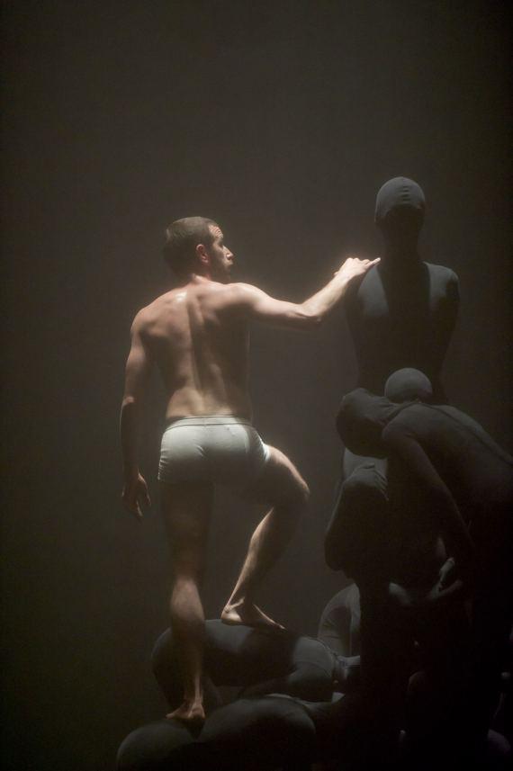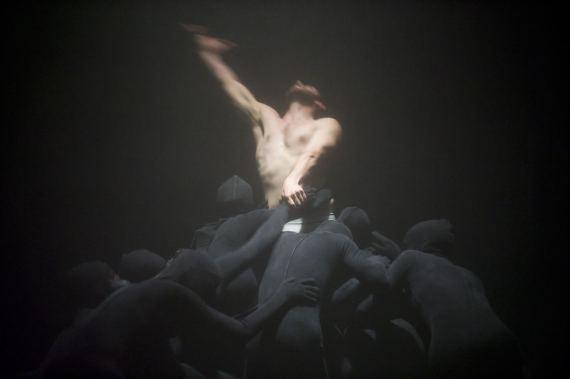 Il faut du temps à l’œil pour s’habituer aux ténèbres qui environnent cet homme ou cet ange déchu pour distinguer du magma tellurique les danseurs vêtus de noir qui le brassent, l’accompagnent, le soutiennent ou le manipulent tandis que la silhouette pâle se refuse ou s’offre, se tord ou lutte. La composition musicale de François Cafenne fait gronder l’orage et rôder le tonnerre, tempête et flots, tandis que les images déferlent, évoquant tour à tour, la guerre, le gouffre, la menace, le carnage, la luxure, la volupté, la puissance de l’homme au milieu de ces fantômes anonymes et même cendre et poussière quelque chose de génocidaire. L’ange est-il celui avec lequel Jacob se battit jusqu’à l’aube ? Ou bien ce Lucifer qui tomba du Ciel en Enfer ? Songe ou cauchemar, les quelques notes de l’Élégie de Wagner « où à tout instant quelque chose peut surgir du Rien »[1] laisse planer un suspens. Et comme souvent, chez Olivier Dubois (et en cela, sans doute, ressort son passage chez Jan Fabre), le sens dernier reste de l’ordre de l’indécidable, entre la compassion et la cruauté, la téléologie du héros ou celle du sacrifice.