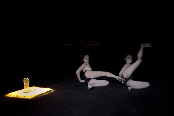 La pièce, découpée en sept tableaux, fait apparaître ces trois femmes dans un environnement surprenant qui mêle à la danse des œuvres plastiques de Michel Caron, le piano donc et la musique électroacoustique d’Alain Mahé. Cela crée un univers étrange et incertain, comme si l’on convoquait effectivement sur le plateau des âmes disparues en faisant apparaître quelques fragments qui les rappellent.