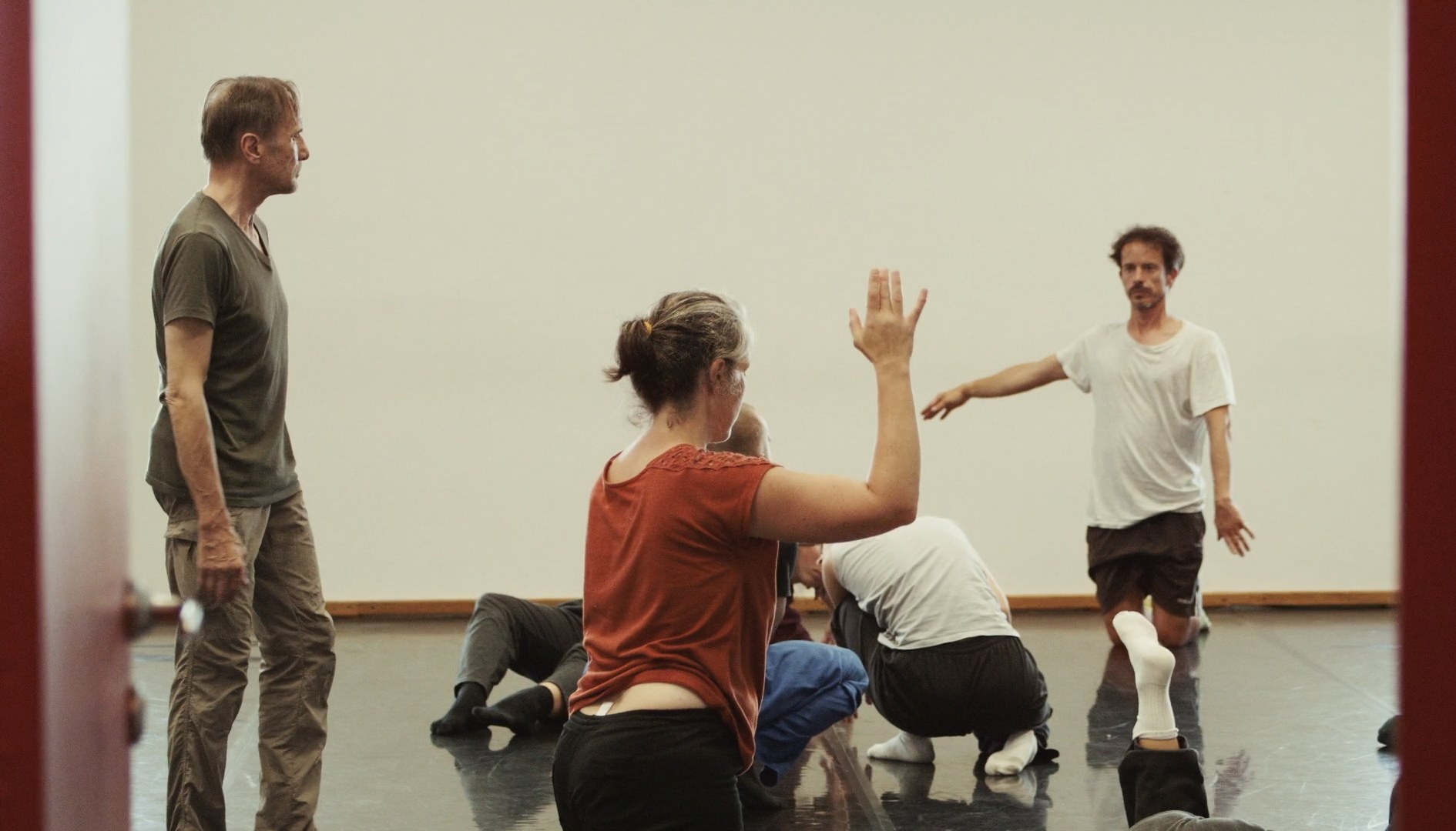 Julie Charrier : C’est Dominique Petit qui m’a contactée. Il voulait faire un documentaire, et j’avais réalisé une performance intitulée Les Yeux où j’essayais de montrer ce que voyaient les danseurs en dansant grâce à des caméras embarquées dont l’image était relayée sur un écran géant et s'appelait Zyeux. C’était important pour moi, car j’ai été danseuse et d’ailleurs étudiante au CNDC, avant de passer à l’image, et, être dans la tête d’un danseur est une quête au fond très personnelle. D’où l’idée de rendre visible tout ce processus avec Compositions, puisqu’il s’agissait d’une master class sur l’improvisation, la composition, et la performance. Et ma problématique est de transmettre la sensation des stagiaires et l’intensité du processus pour les gens extérieur. J’ai alors demandé à Dominique Petit que les vingt danseurs et danseuses soient des gens extérieurs issus de pratiques, d’âges et d’expériences différentes afin de recréer une petite communauté de gens qui s’expriment à travers leurs corps, de manière simple. Donc il y avait des jeunes de seize ans en provenance du Conservatoire de La Roche-sur-Yon où Dominique a enseigné longtemps, à une comédienne du théâtre du Radeau de 65 ans.